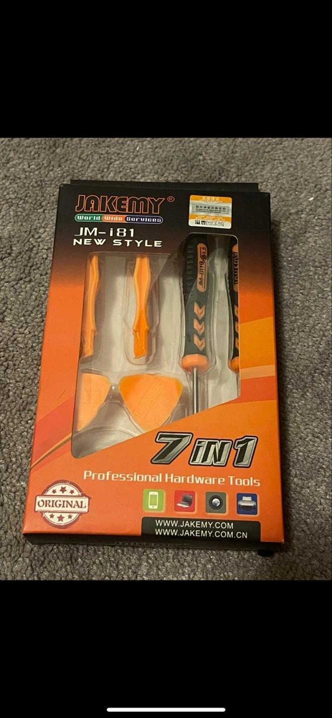 New 7 in 1 professional hardware tools kit. Includes screwdrivers, opening tools, and suction cup. Ideal for electronics repair. Made in China.