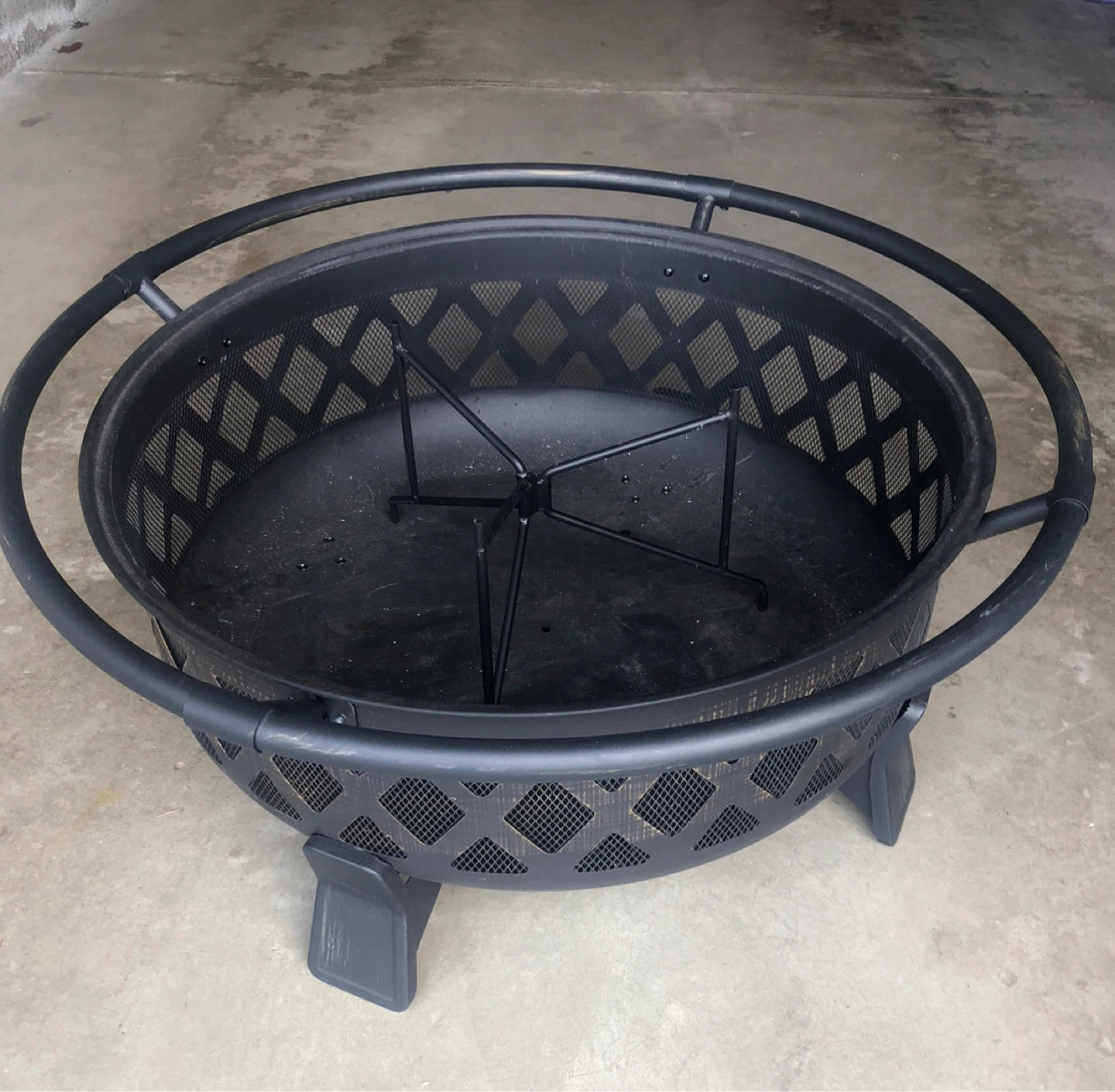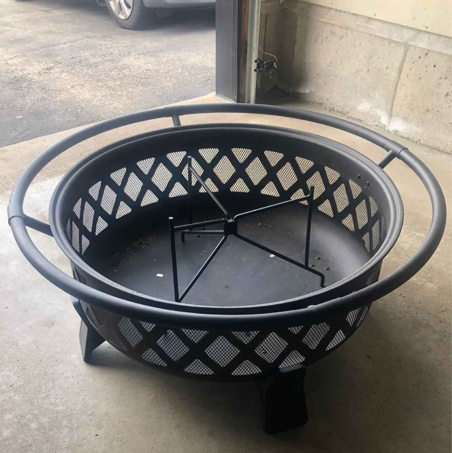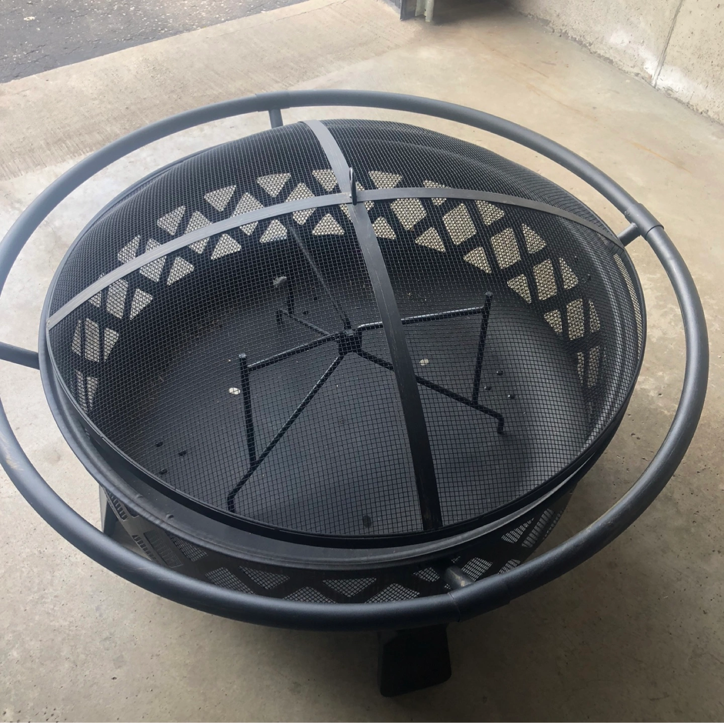 Large black metal fire pit. Features a decorative patterned bowl and a circular safety screen. Sturdy metal construction. Perfect for backyard gatherings.
