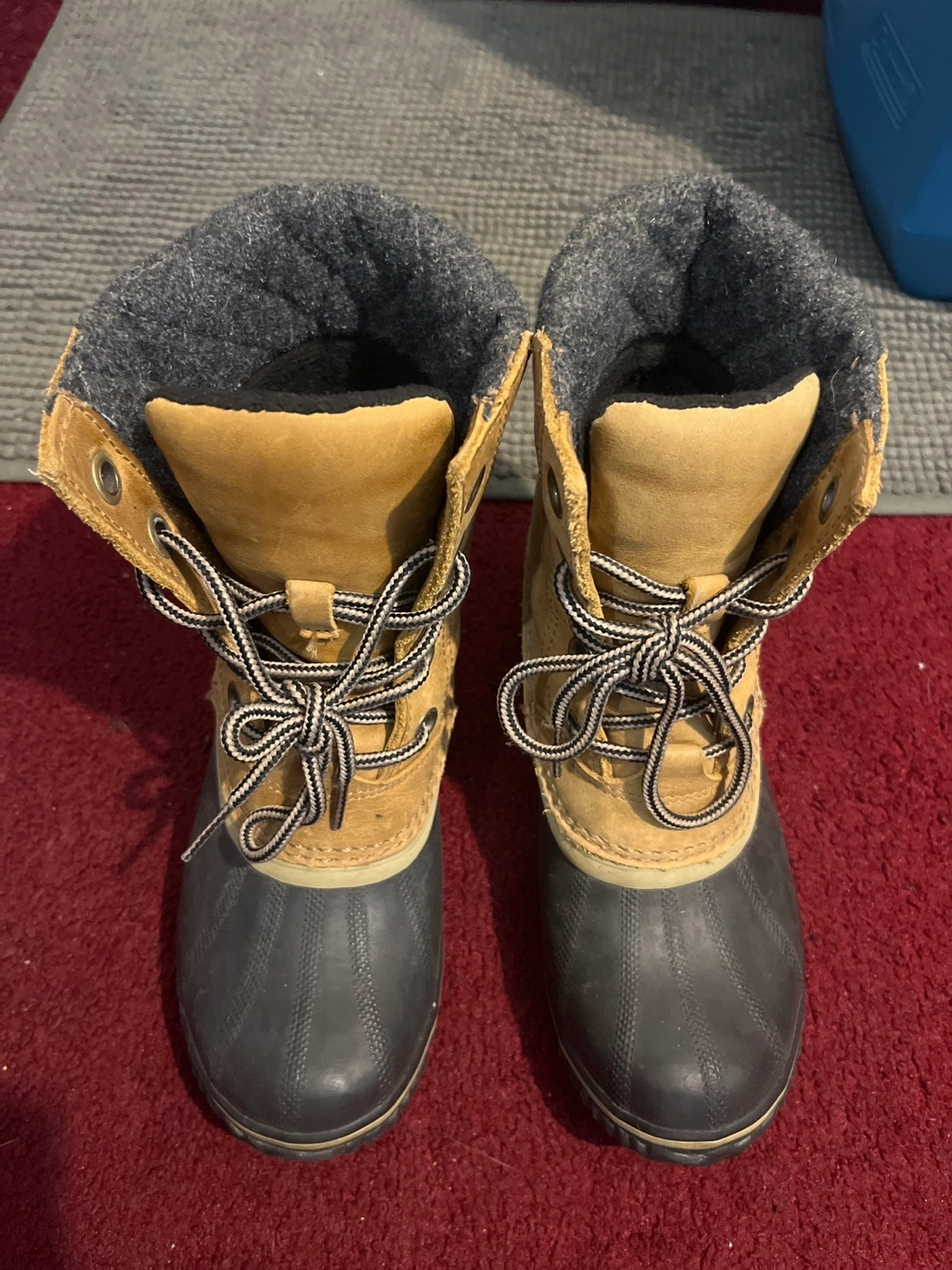 245Tan leather winter boots. Lace-up style. Wedge heel. Good for snow. Warm lining.