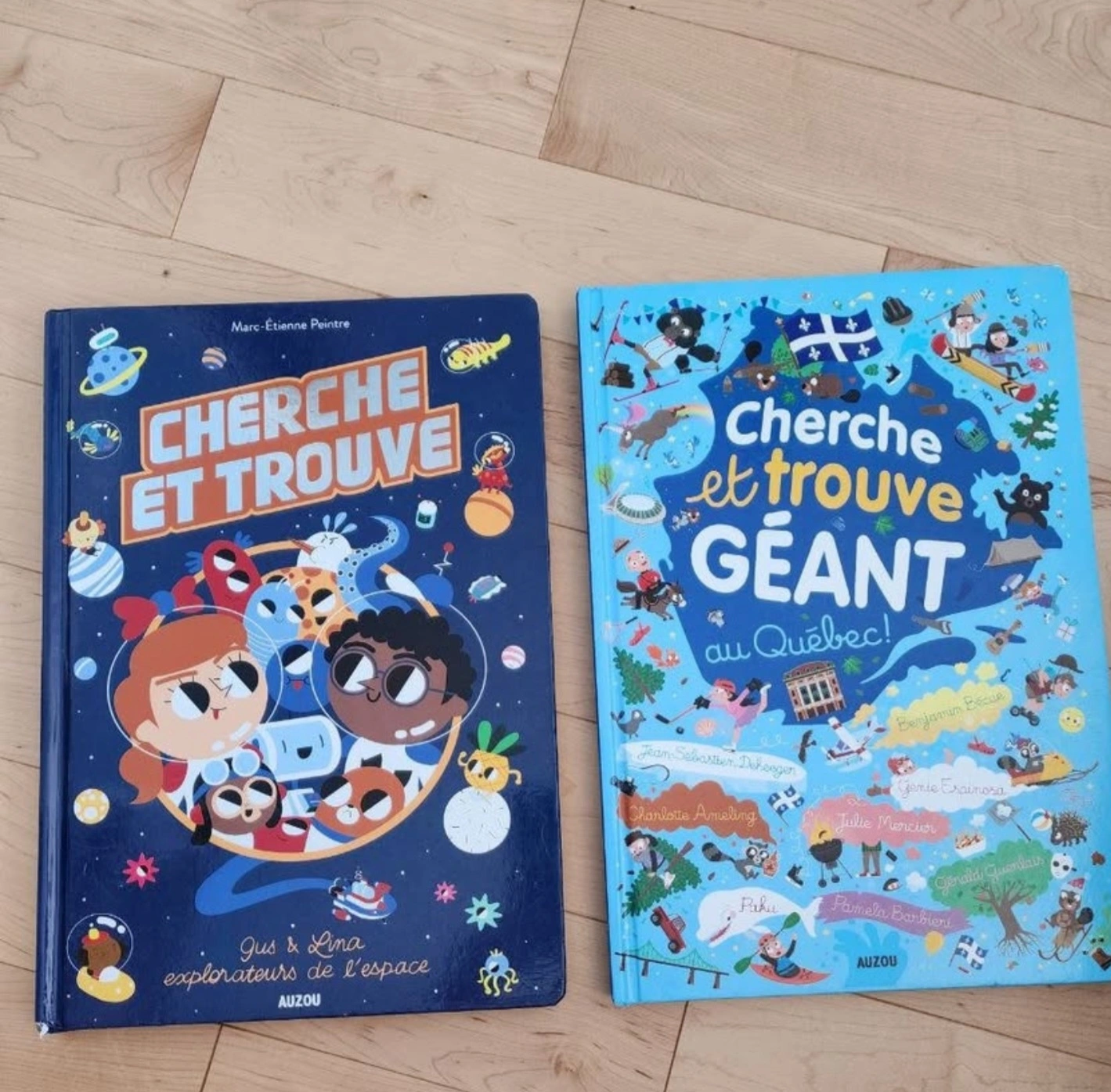 Set of two Cherche et Trouve children's activity books. One features space explorers, the other is Quebec-themed. Large format, colourful illustrations, and many hidden objects to find.