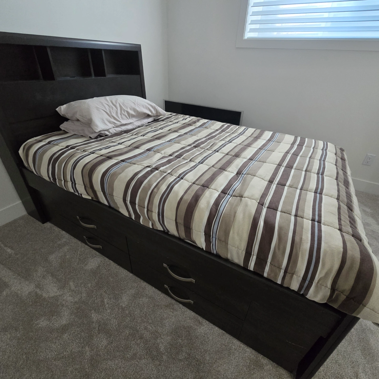 Full Size/Double bed frame features built-in headboard with shelves and drawers for storage. Great condition. Price is firm. pick up in Sherwood Park