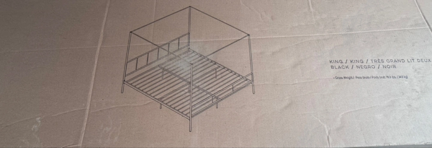 Original box, king size metal bed frame. Black finish. Canopy style. 1 year old, all parts and instructions included.
