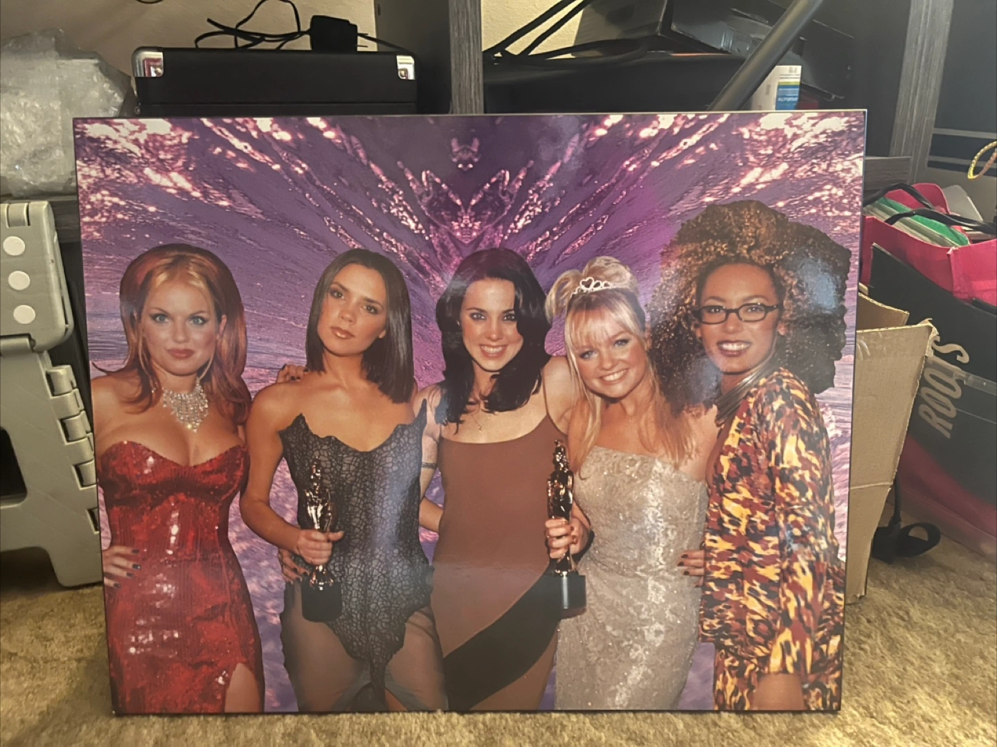 135Large framed photo print featuring the Spice Girls. Great for a fan. Image shows the five members in dresses, holding awards. Purple background.