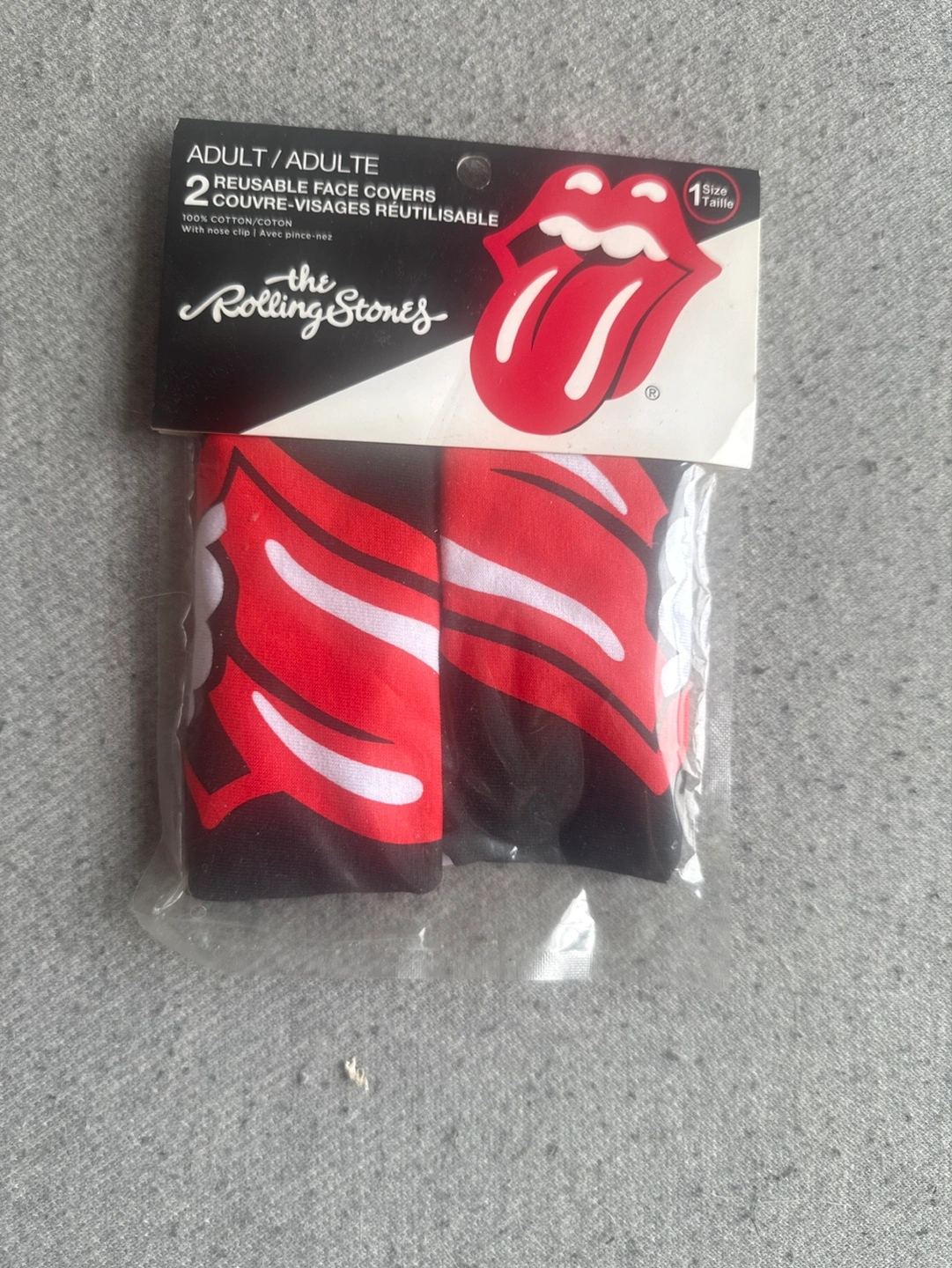 Two adult-sized reusable face covers. 100% cotton. Features the Rolling Stones logo. Includes nose clip.