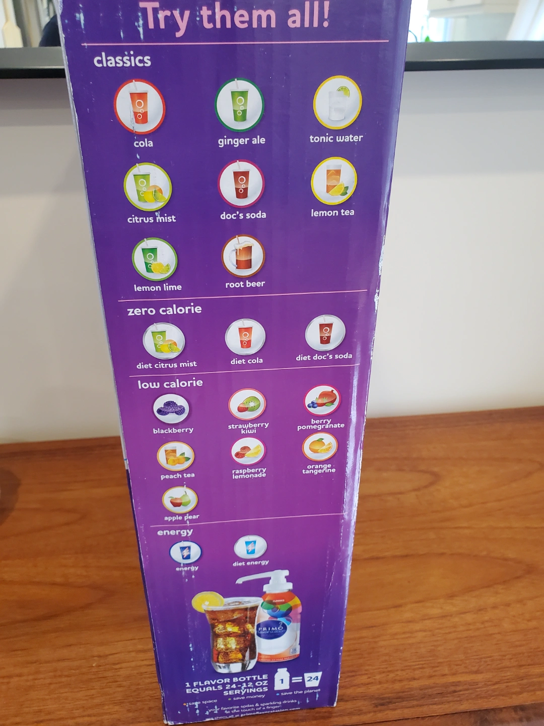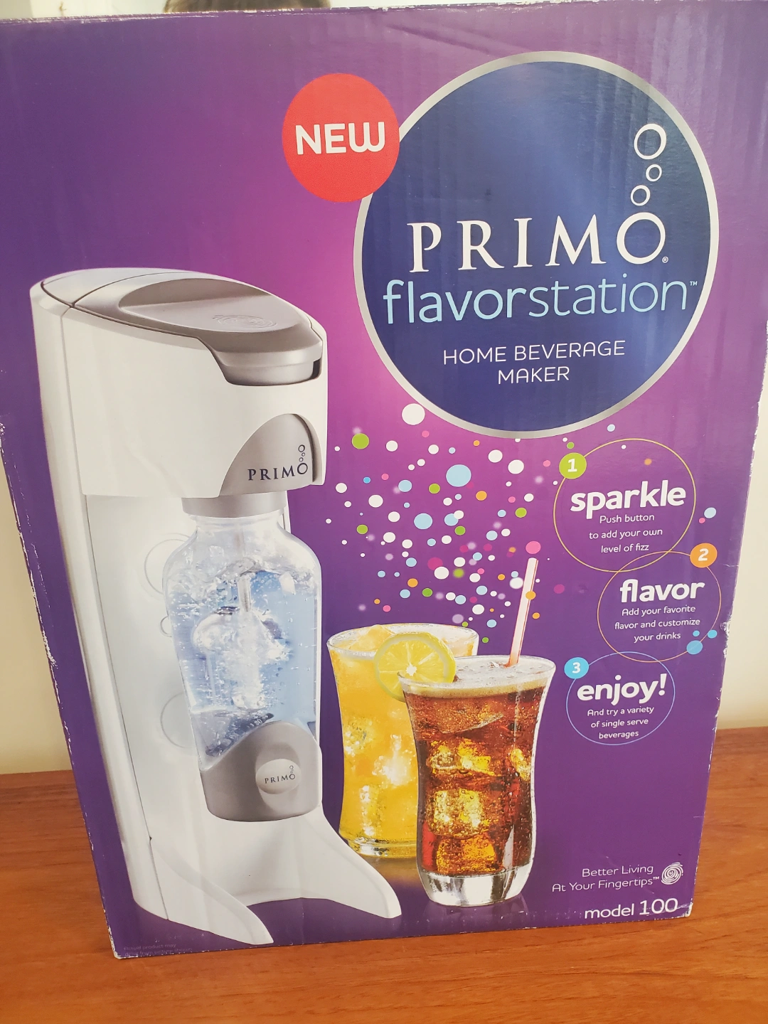 New Primo Flavorstation model 100 beverage maker. Includes carbon dioxide cylinder, bottle, beverage, mix pumps, and a spoon. Make custom carbonated and sparkling water beverages. New, never used. No flavours included. Get ready for summer bbq fun!
