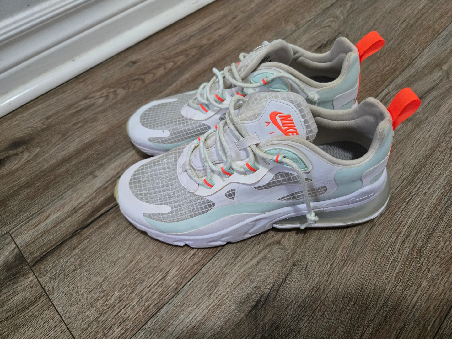 Women's Nike Air Max 270 React running shoes. White, light teal, and orange accents. Lightweight design.