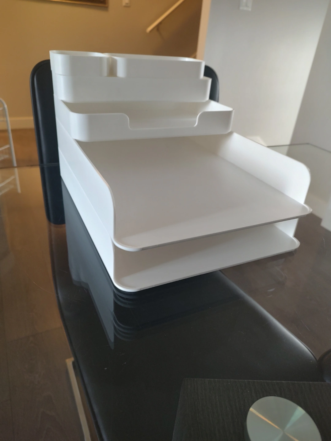 Multi-tiered desk organiser. Great for organising stationery and other desk items. Includes several trays and compartments of varying sizes. Durable plastic construction. Perfect for home or office use.