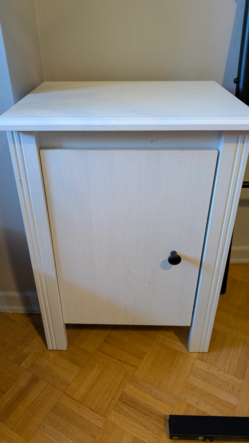 Ikea Small white nightstand. One cabinet door with a shelf inside. Simple design. Good for bedroom or small space.