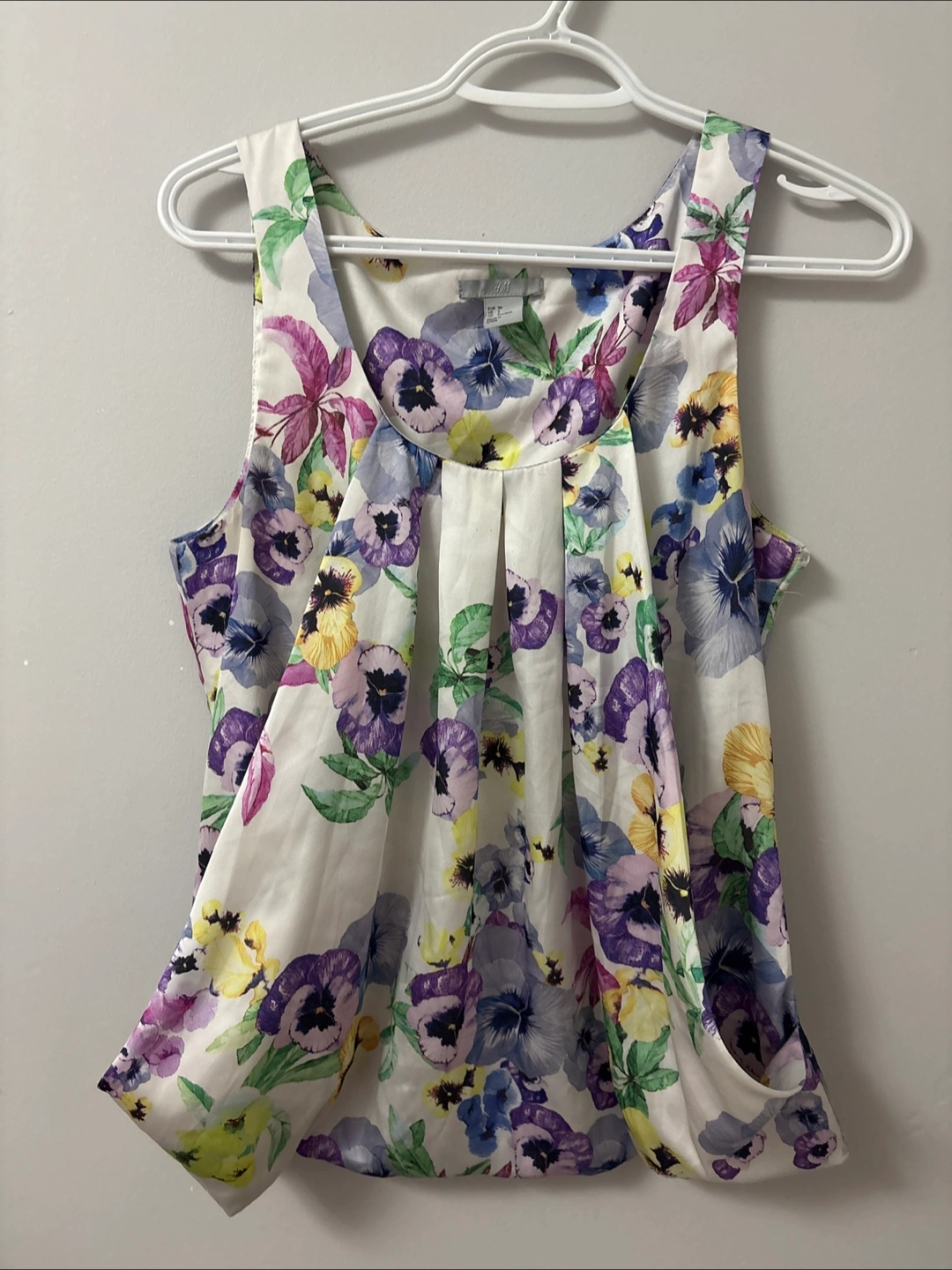 Beautiful floral sleeveless top. Size small. Pleated detail at the front. White background with colourful pansies. Lightweight material, perfect for spring or summer.