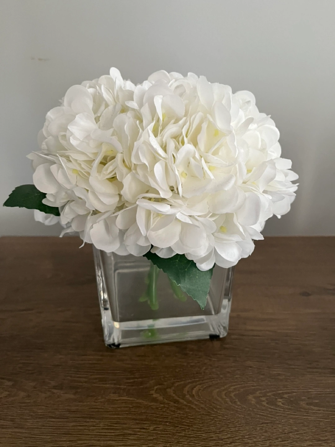 Beautiful artificial white hydrangea arrangement. Perfect centerpiece or home decor. Comes in a clear glass cube vase.