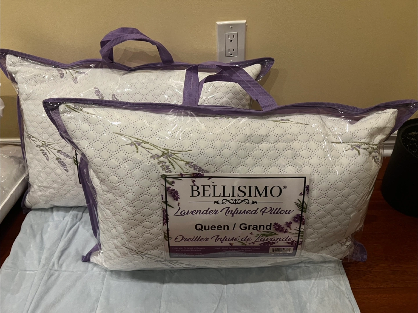 Two new BELLISIMO lavender infused pillows. Queen/Grand size. White quilted fabric with lavender design. Packaged pillows.