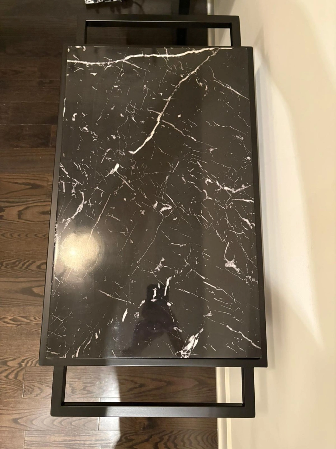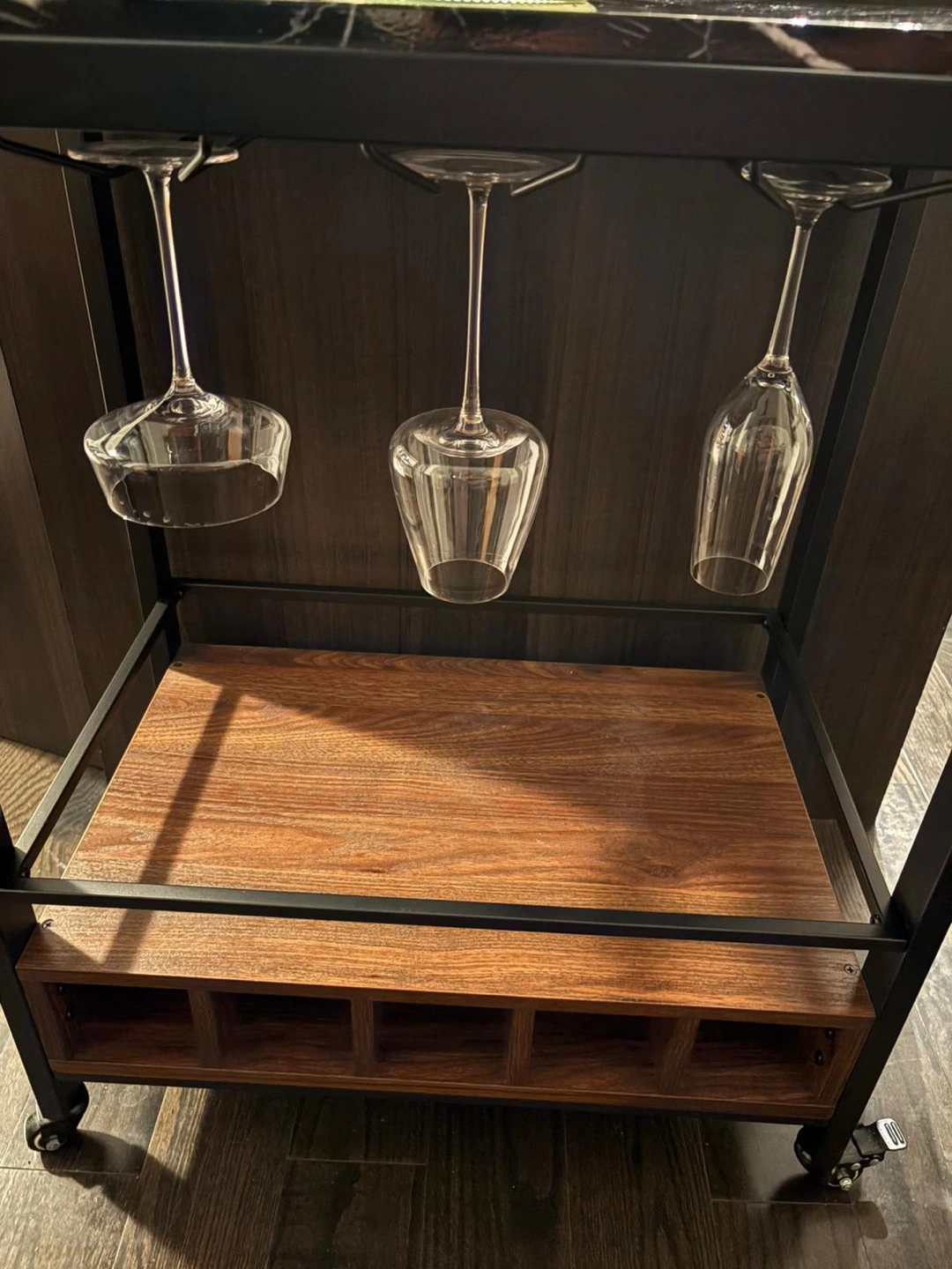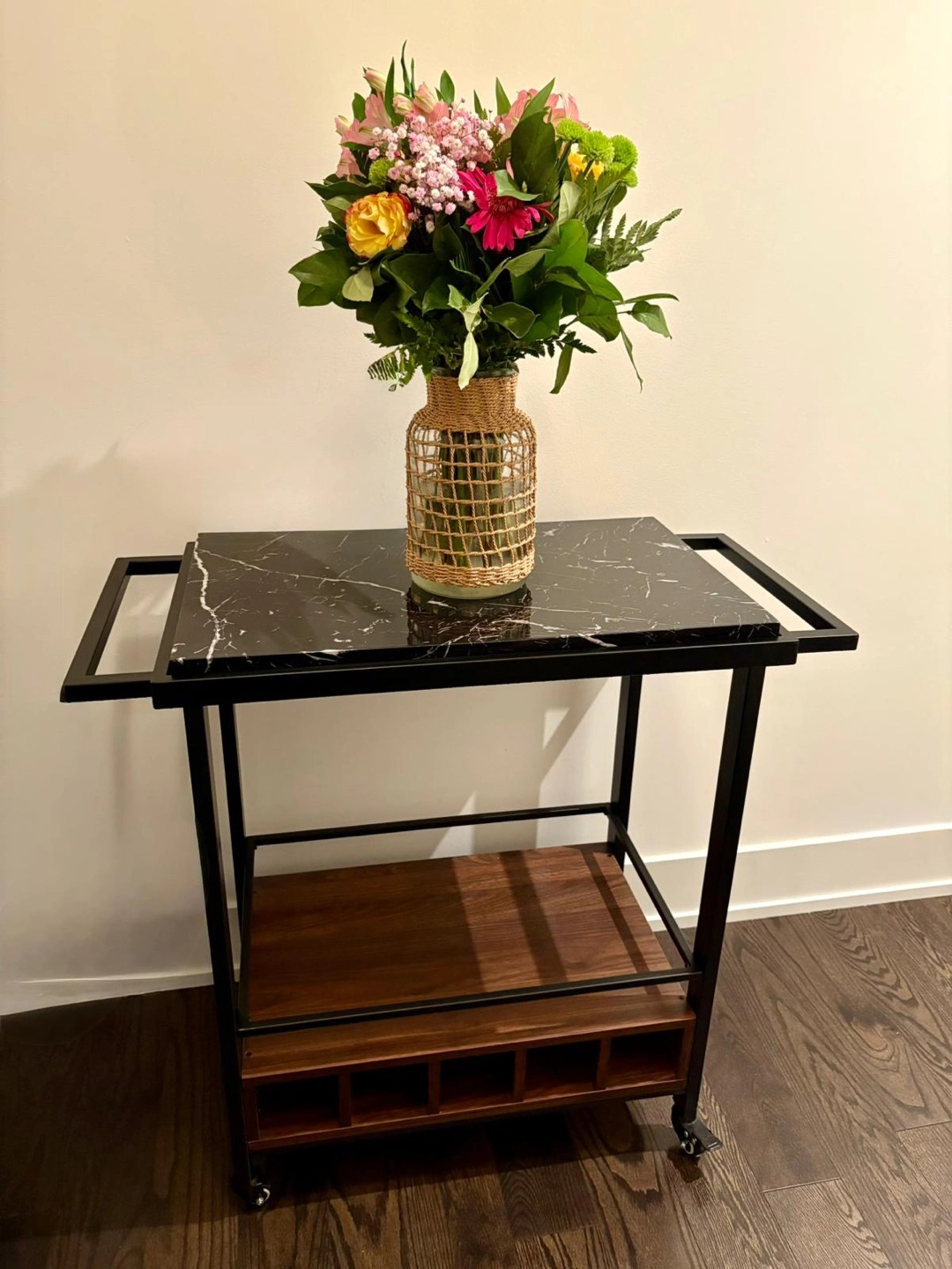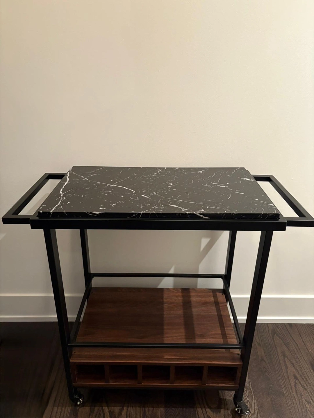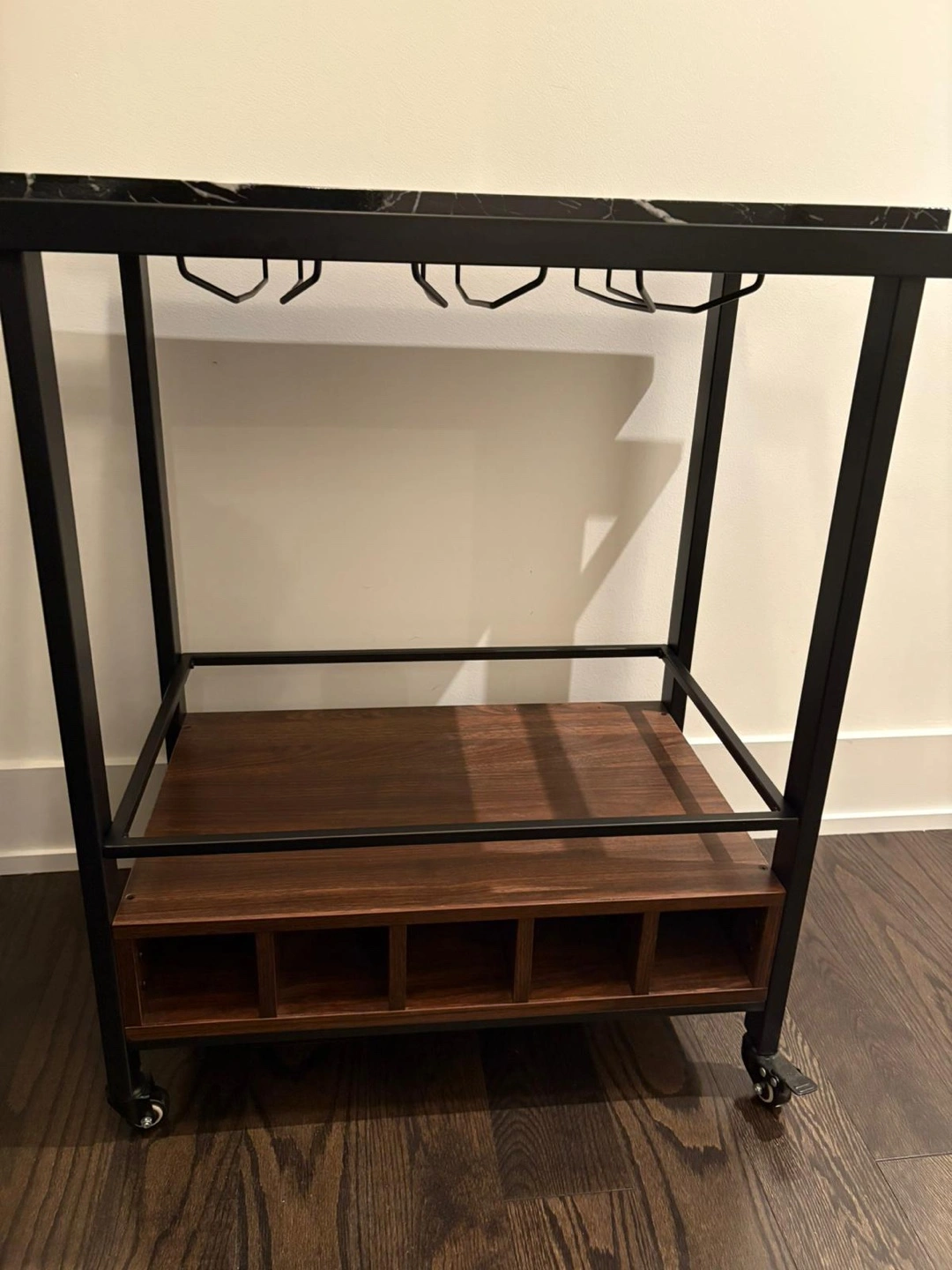Stylish bar cart. Features a black metal frame, black marble top, and walnut-coloured wood lower shelf. Includes hanging stemware rack and wine bottle shelves.