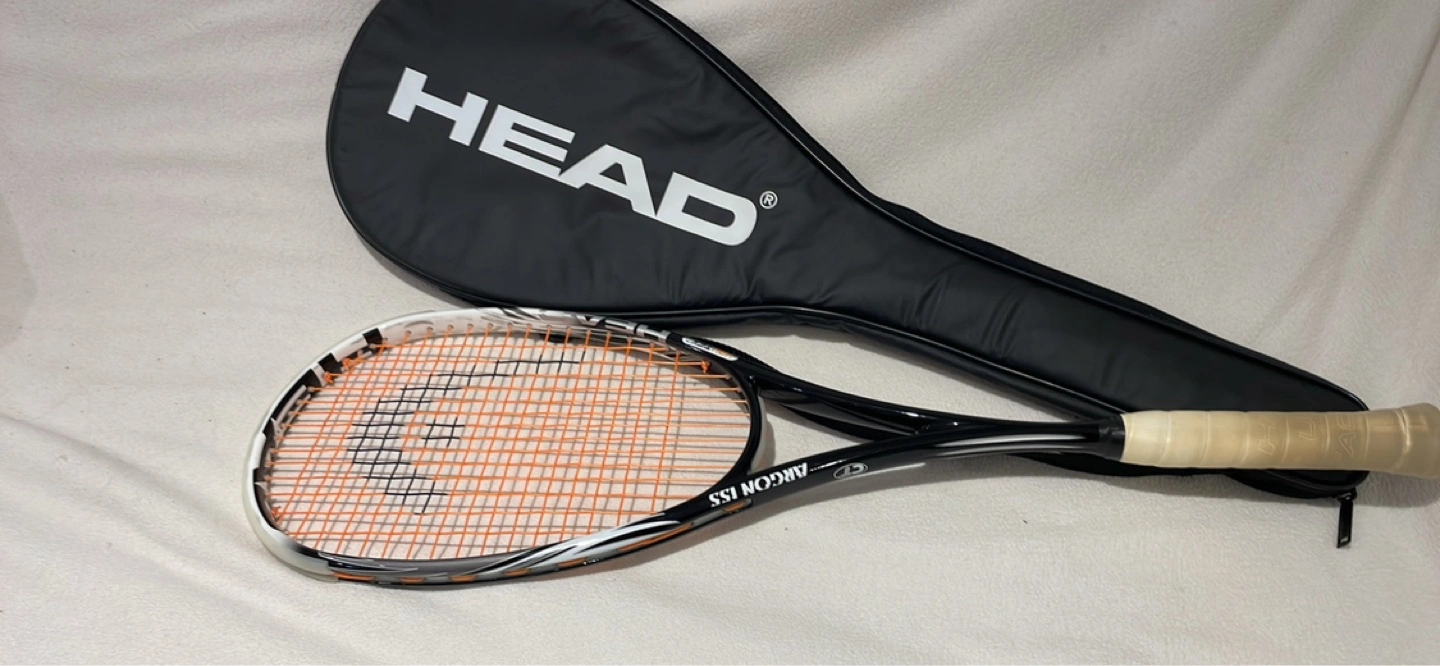 Used HEAD Argon 155 squash racquet. Black and orange colour scheme. Includes a black racquet cover. Good condition.