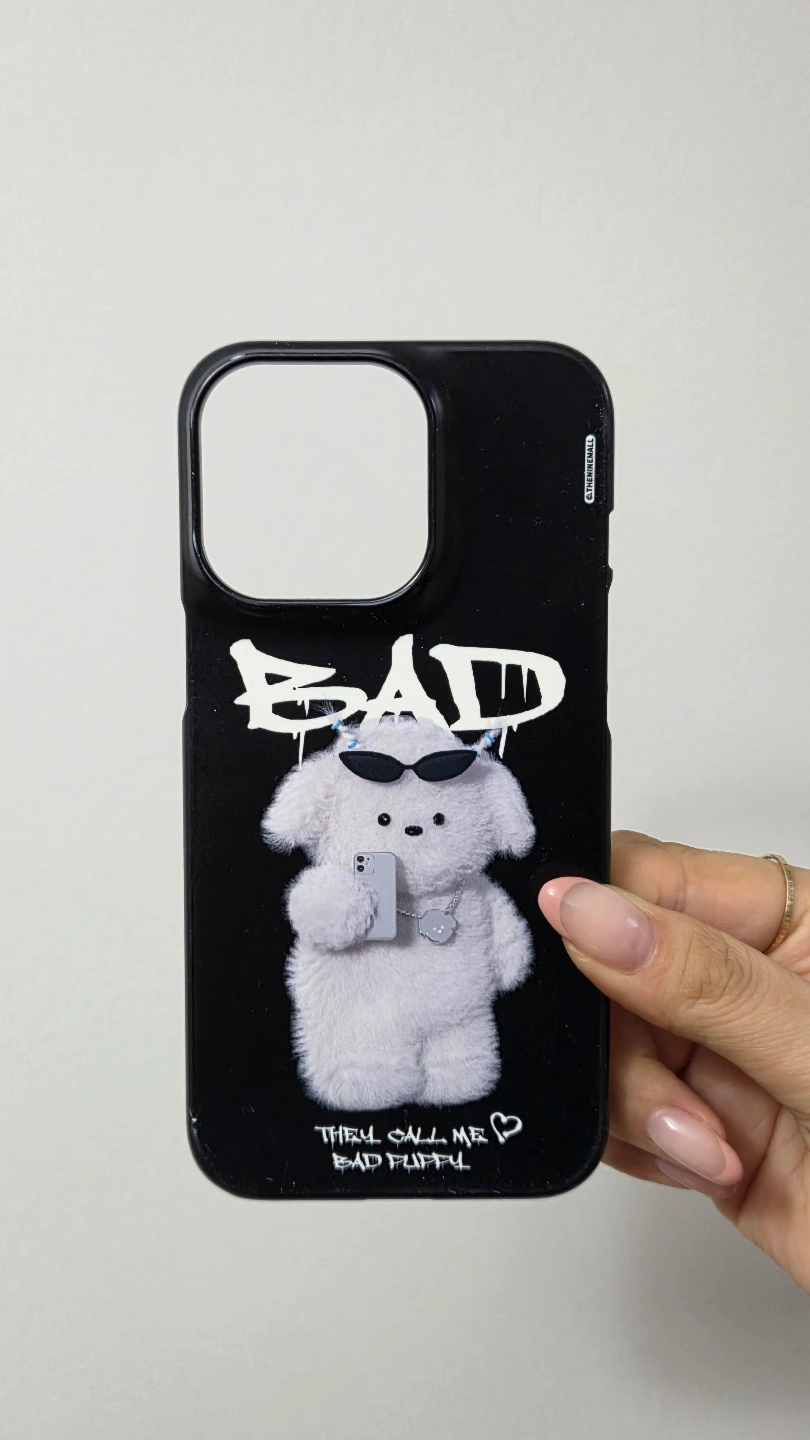 Two phone cases included. One black case features a fluffy dog graphic. The other is an off-white case with a built-in wallet and neck strap. Both compatible with iPhone 13 Pro.