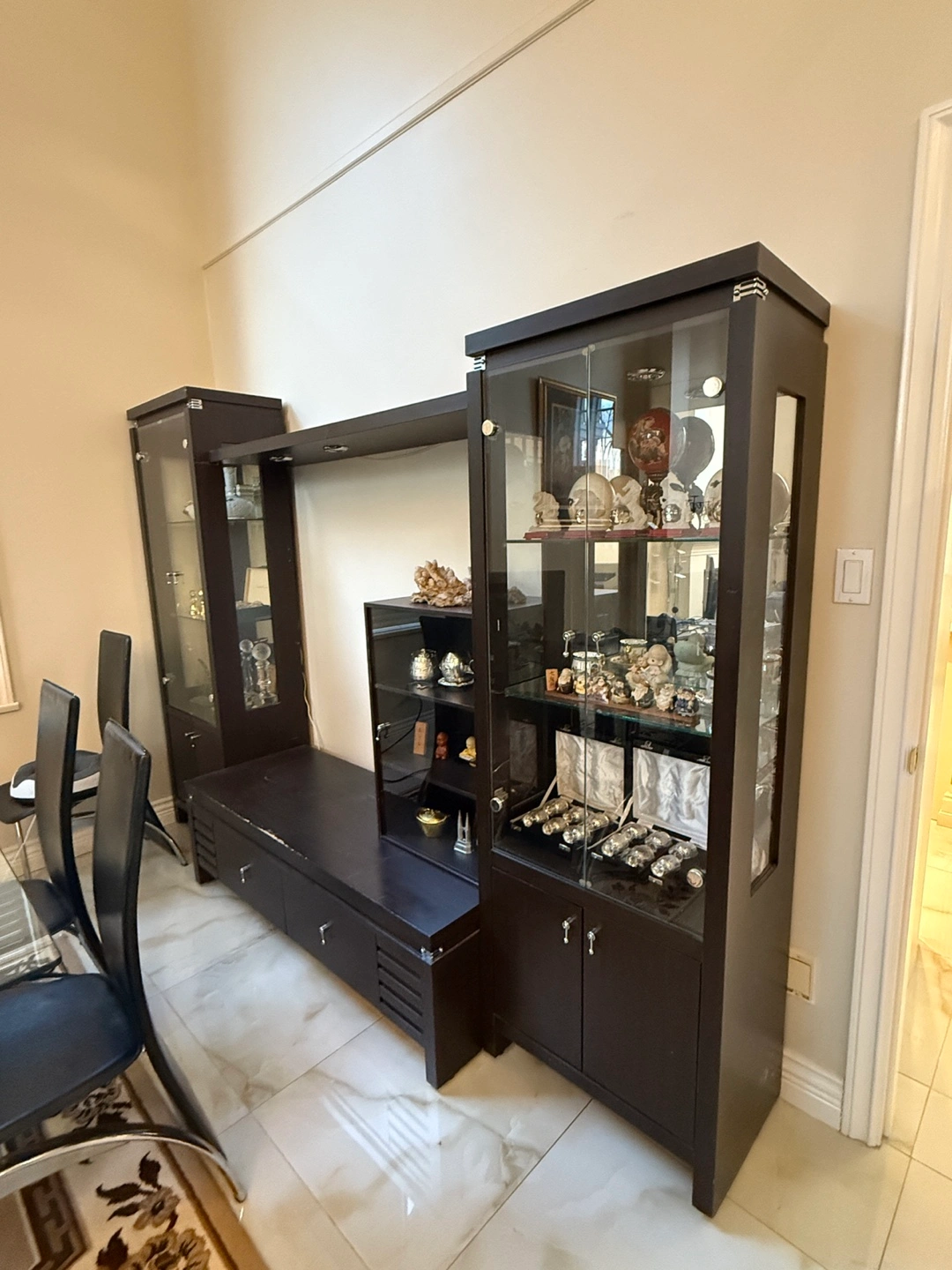 Large entertainment unit. Dark brown wood finish. Features multiple cabinets with glass doors, perfect for displaying collectibles. Includes a long, low section for media components. Good condition.