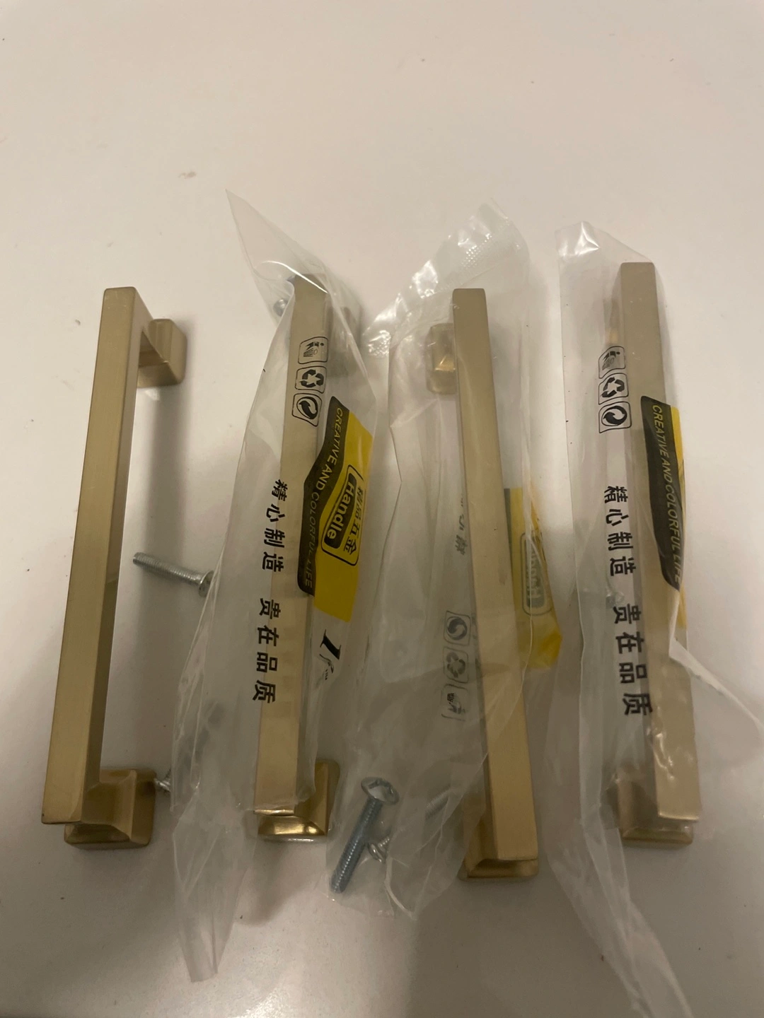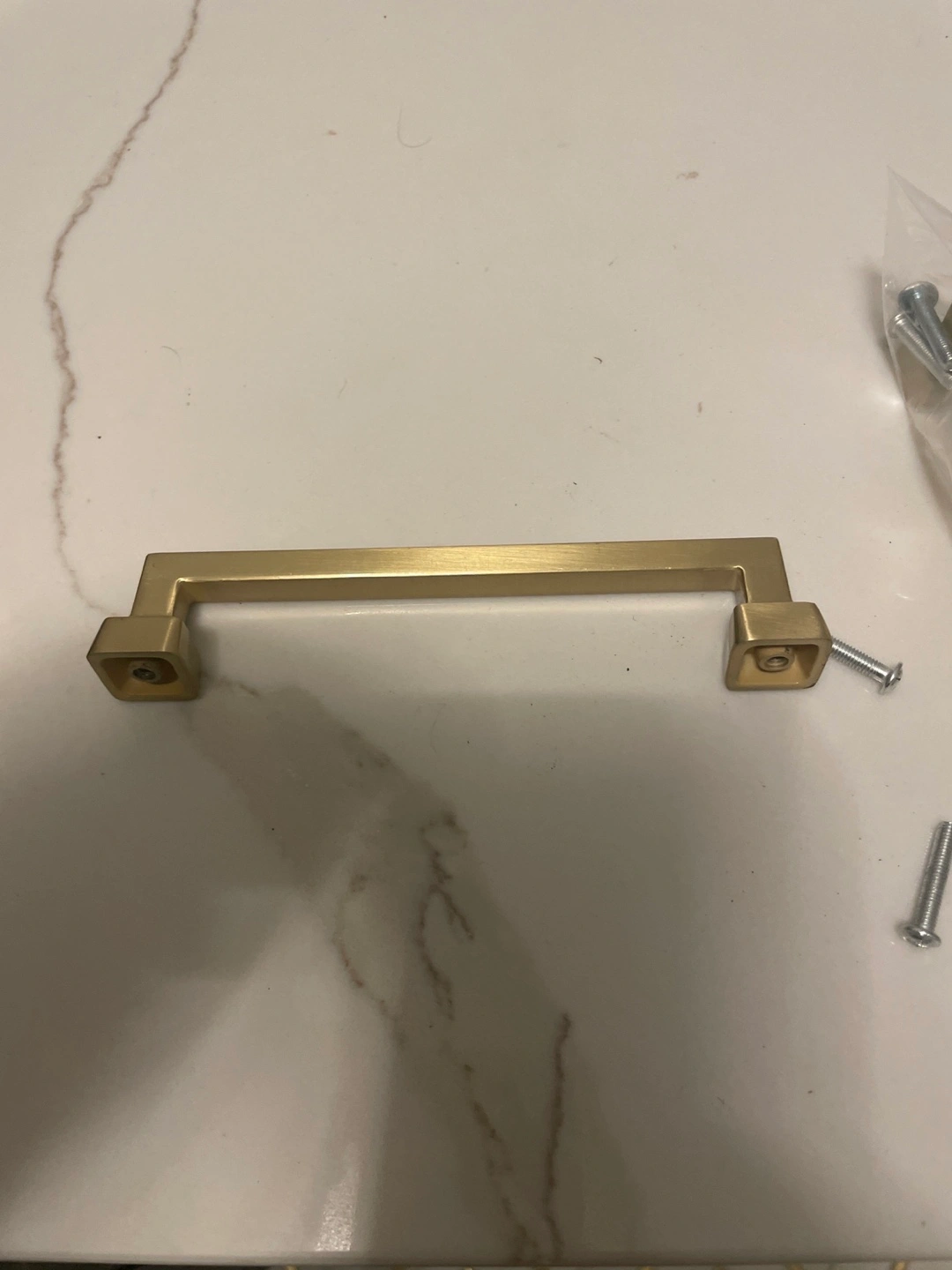 New, gold cabinet pulls. Square ends, brushed finish. Includes mounting hardware. Perfect for kitchen or bathroom renovations.