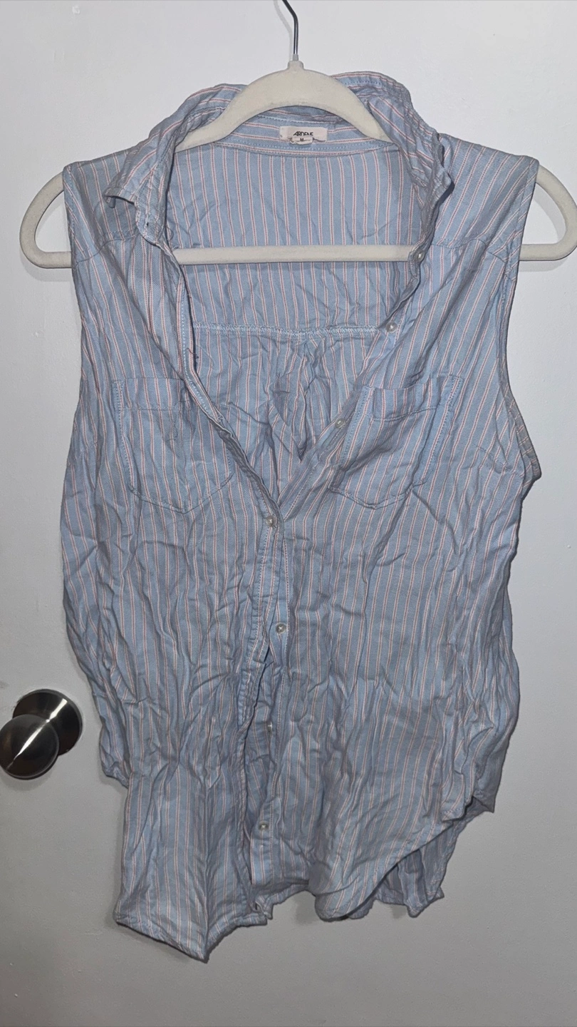 113Light blue and pink striped sleeveless button-down shirt. Size medium. Collared. Two front pockets.