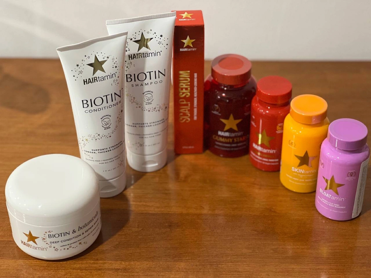 Hairtamin biotin shampoo and conditioner. Biotin and botanicals deep conditioner. Gummy stars and bloatamin supplements. Scalp serum included.