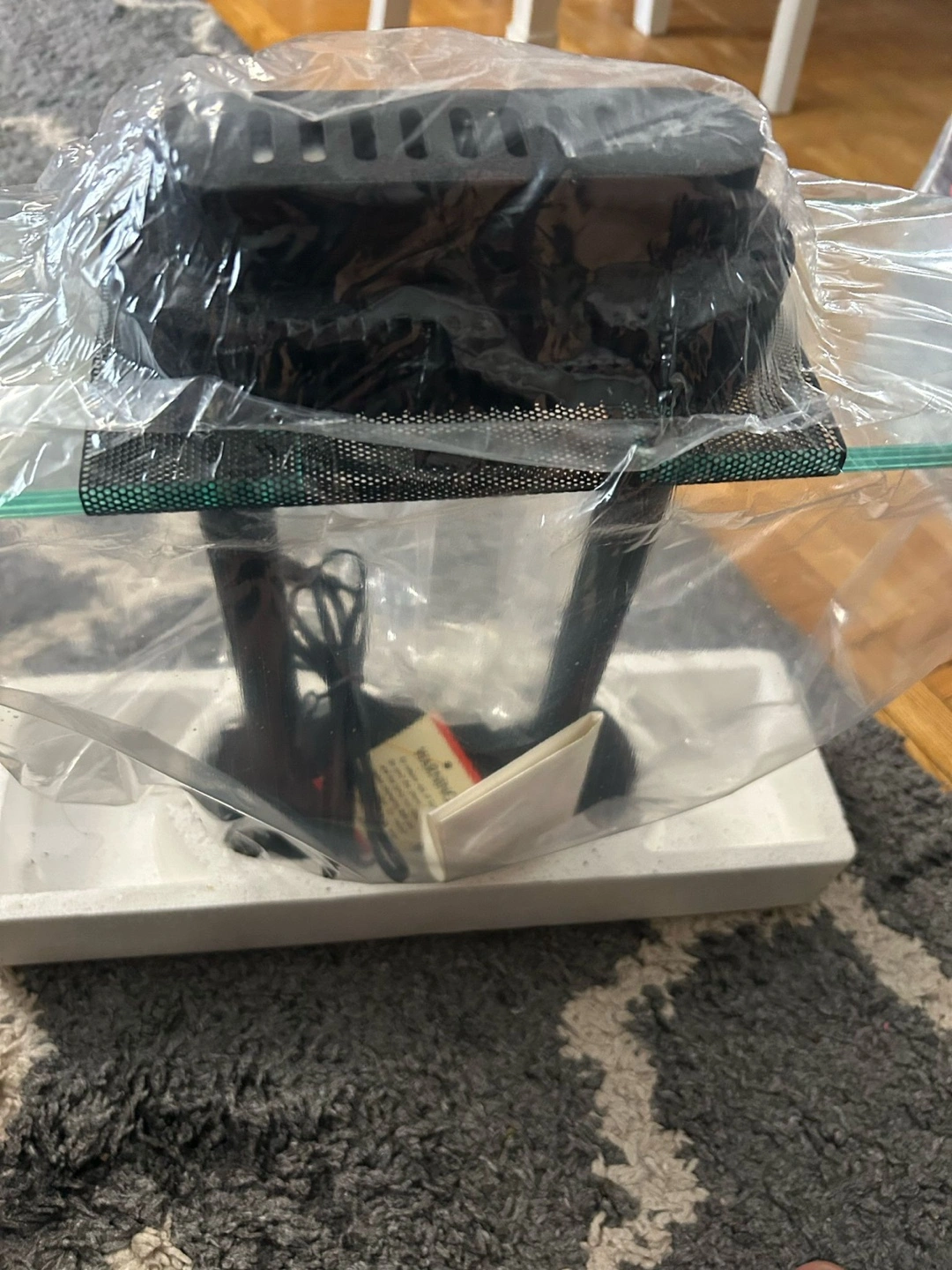 New, never used vintage halogen desk lamp. Glass top, metal base. Comes in original packaging. Features a sleek, minimalist design.