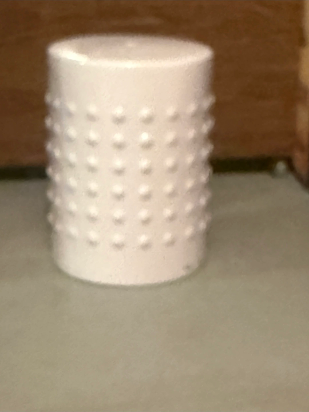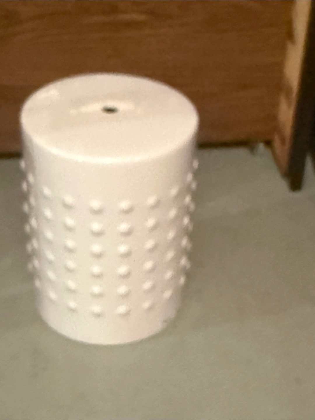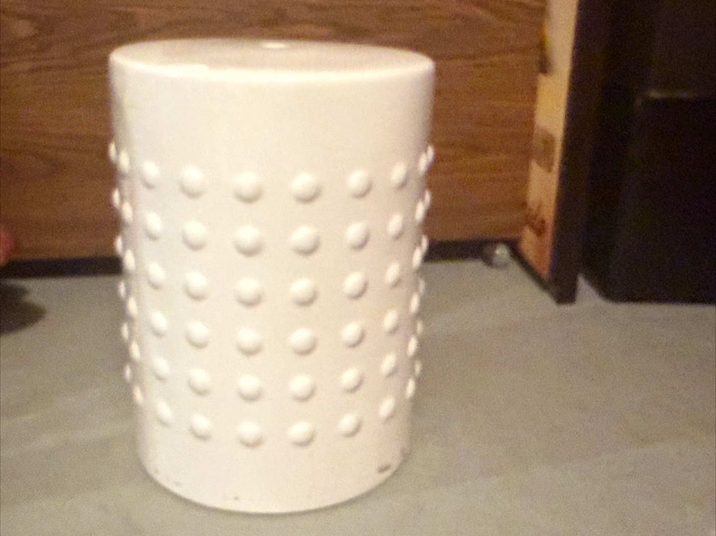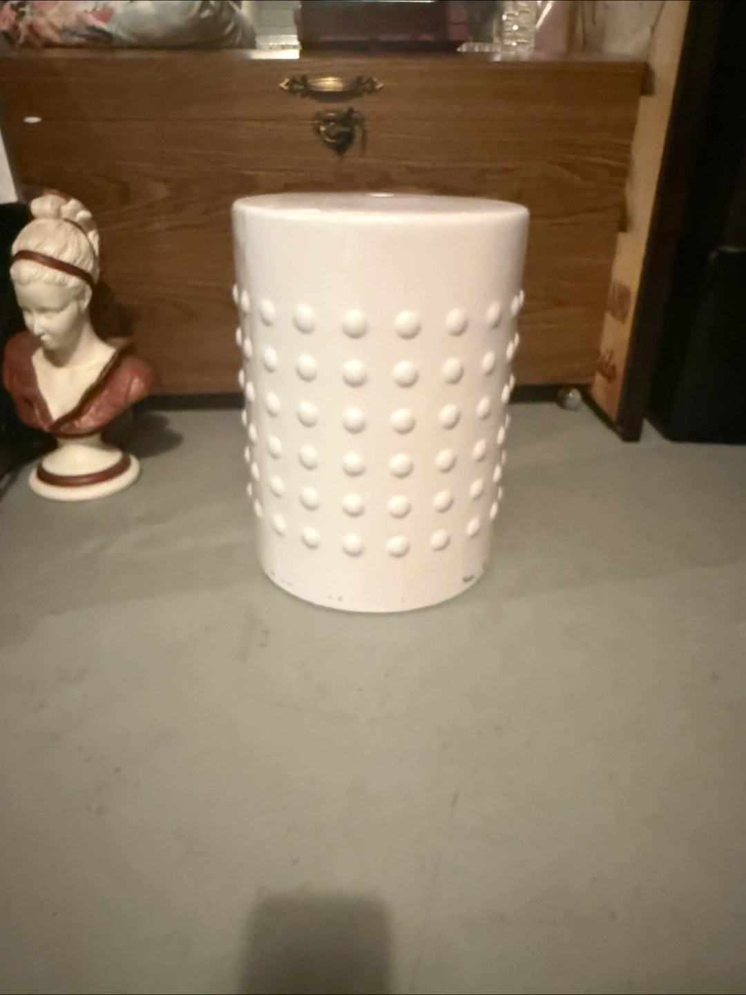 Small white ceramic stool. Round shape with raised dots. Perfect for extra seating or a plant stand.