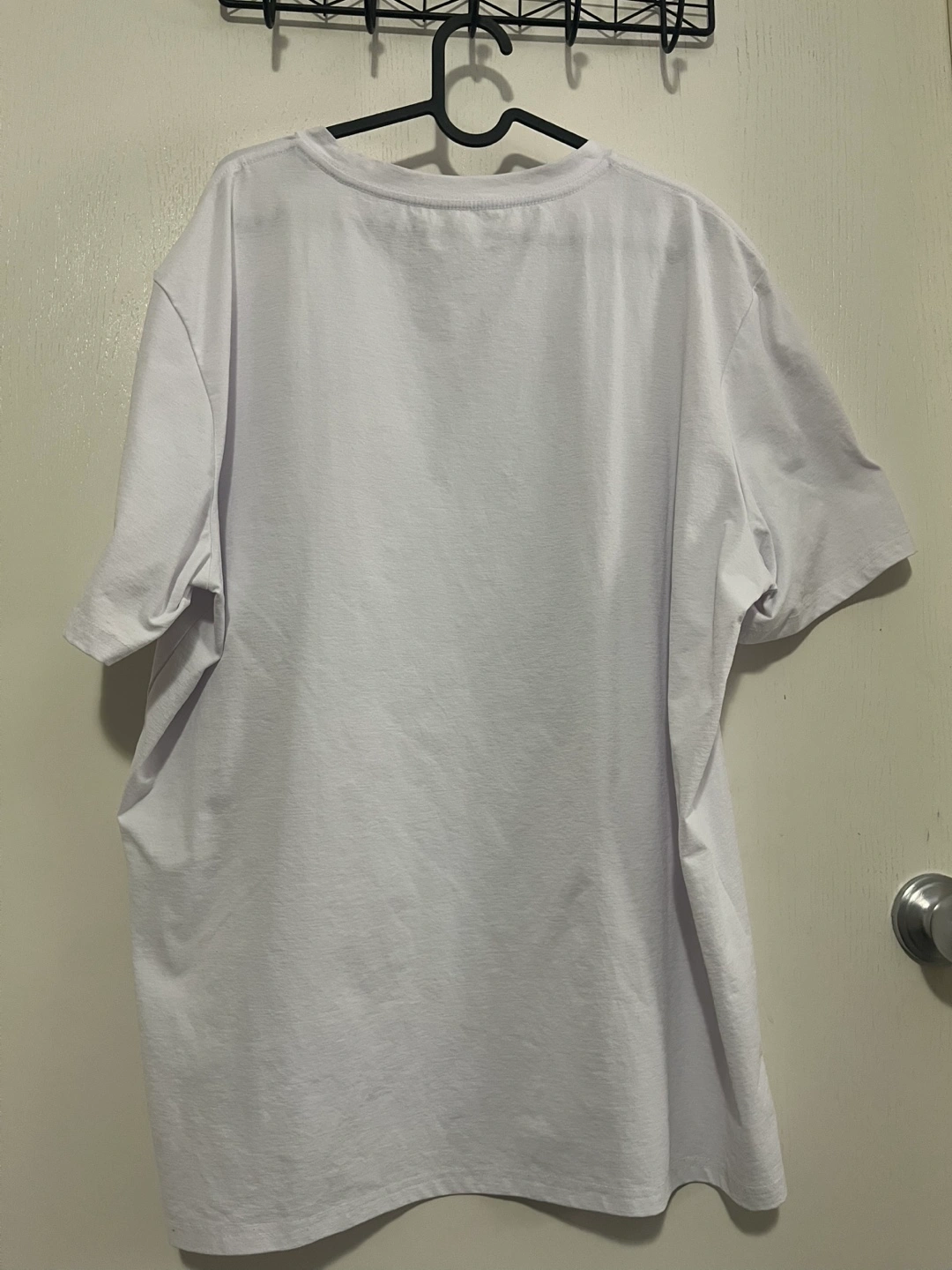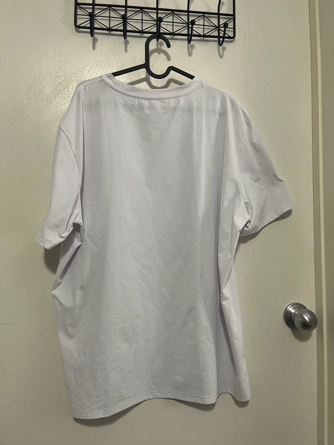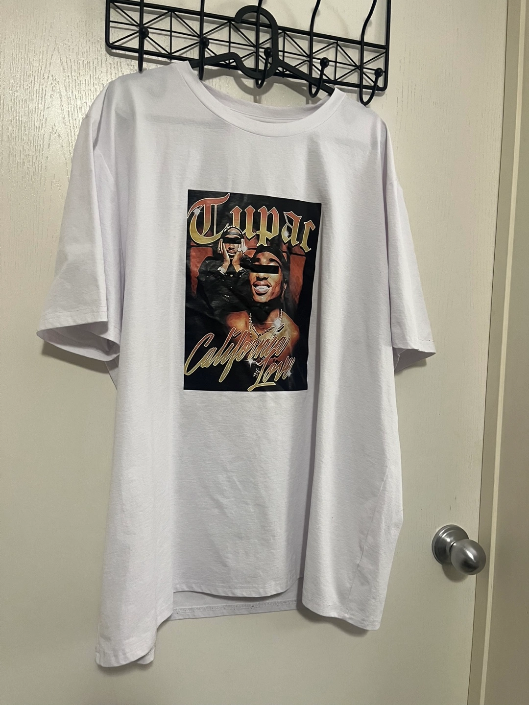 Oversized white t-shirt. Features a large graphic print of Tupac Shakur with the text "California Love". Short sleeves, xxl sits like big xl