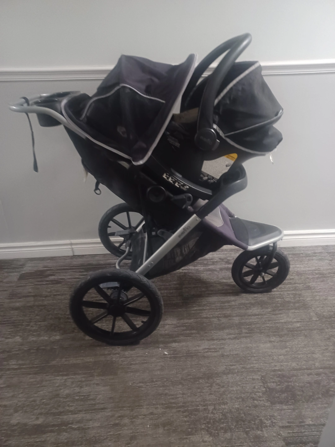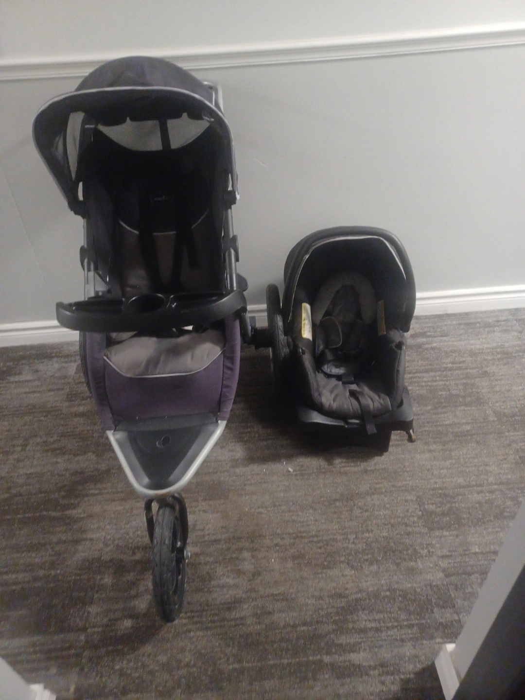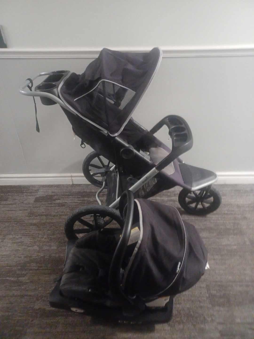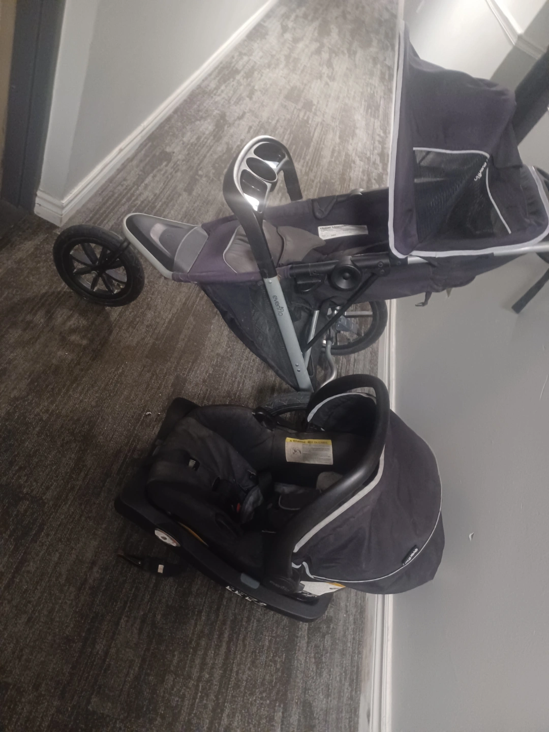 Evenflo Pivot X stroller and infant car seat. Great for travelling and everyday use. Includes cup holders and a large canopy. Stroller easily folds. Car seat is compatible with the stroller.