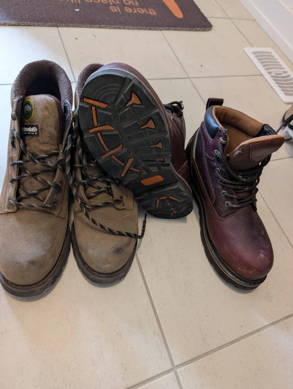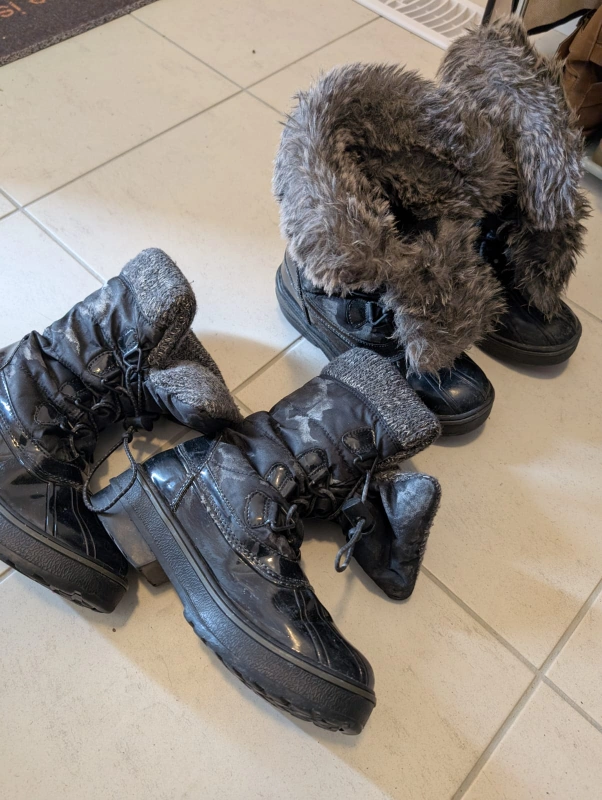 Bundle of six boots, various styles and sizes. Includes work boots, winter boots and kids' boots.