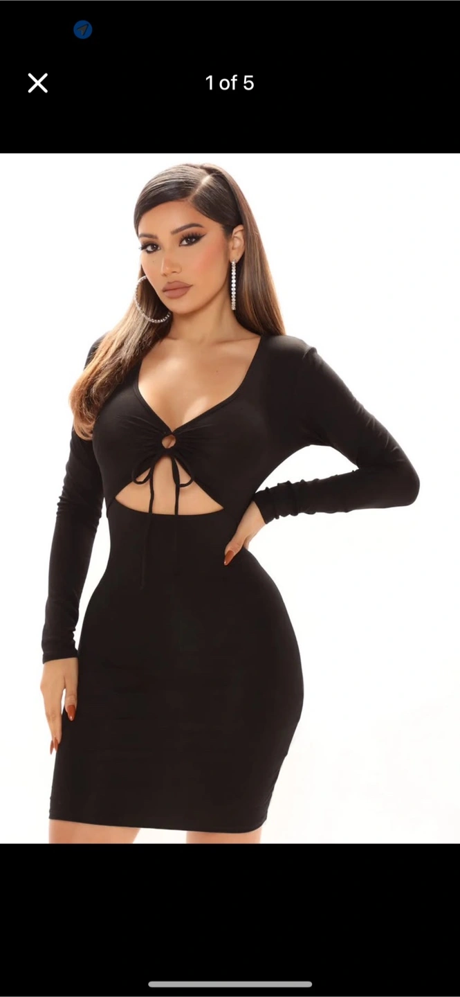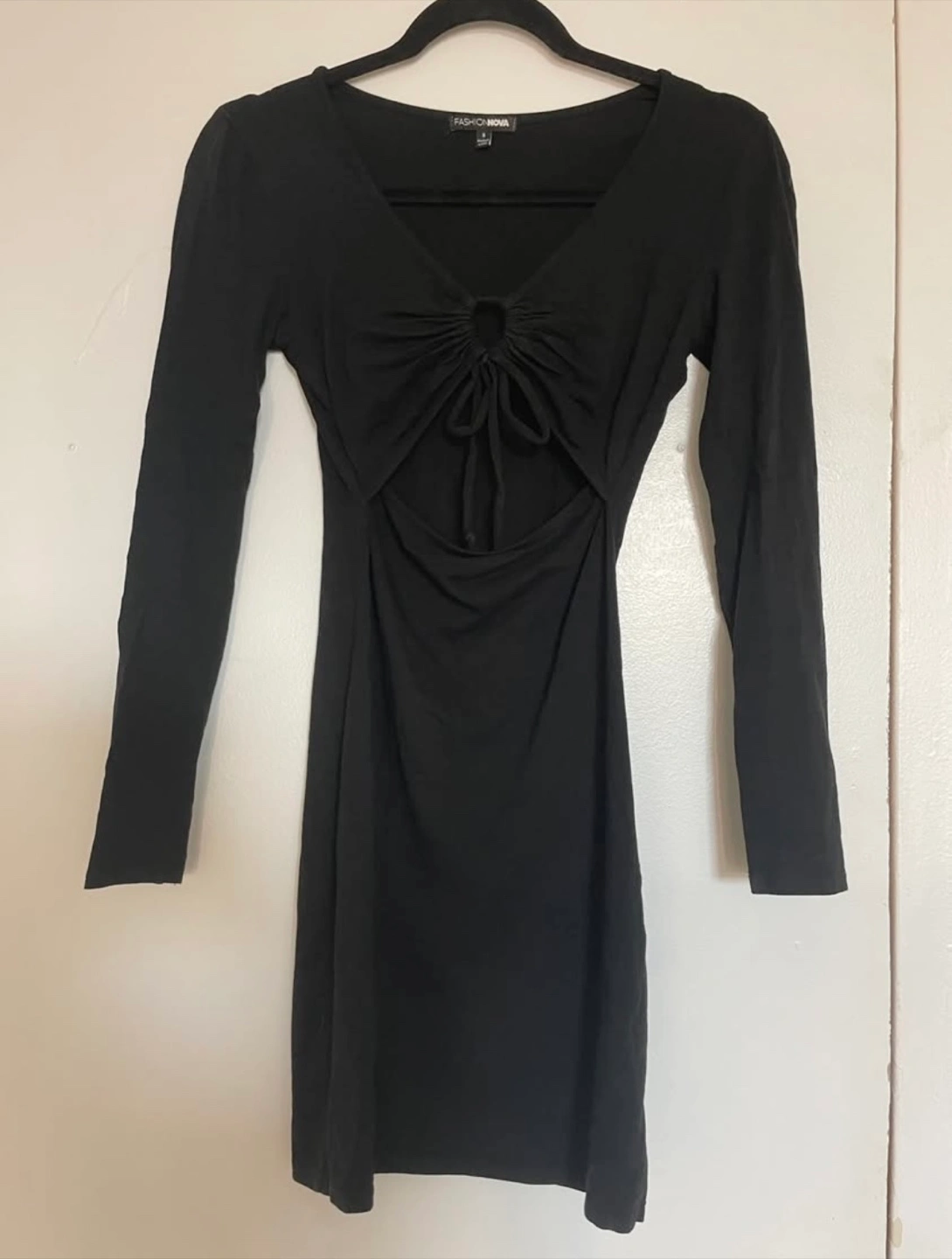 Form-fitting mini dress. Features long sleeves, a V-neckline, and a cutout detail at the waist !