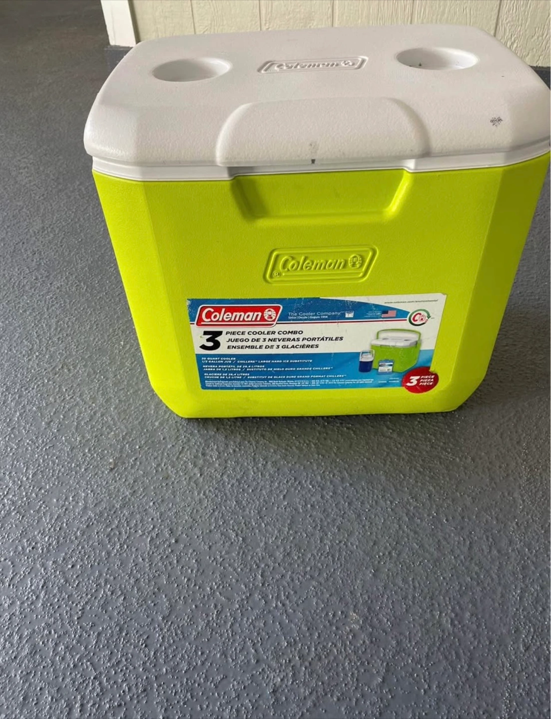 Large capacity cooler, portable and convenient. Great for picnics, camping, or outdoor events. Lime green and white.