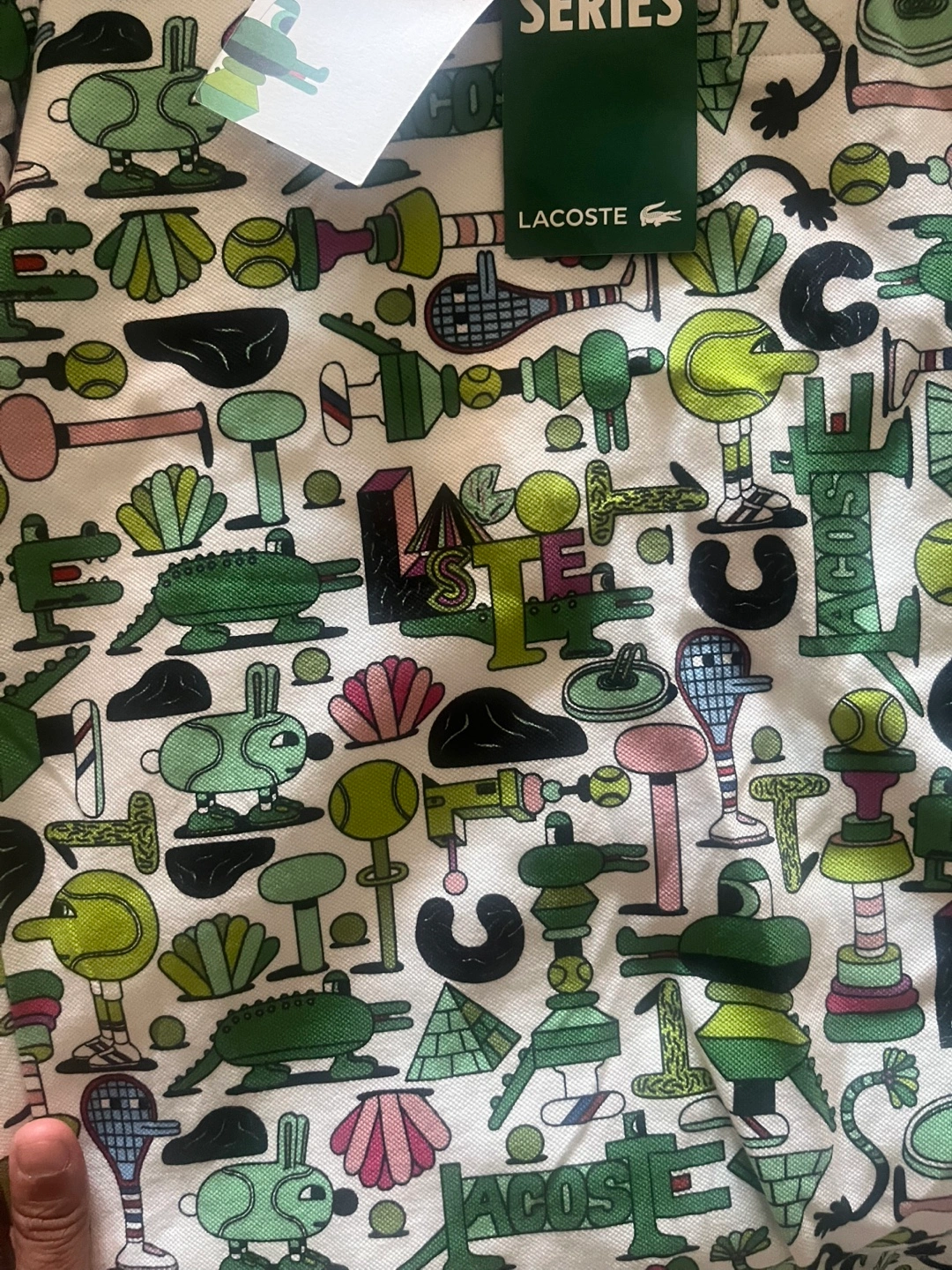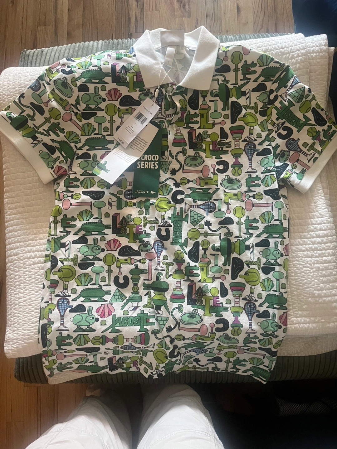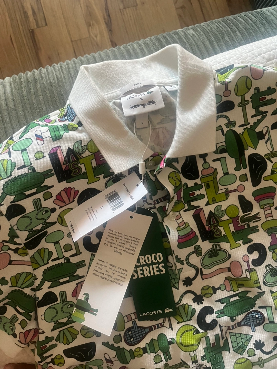 158Size small. White polo shirt. Features a colorful, playful print with various illustrations. New with tags.