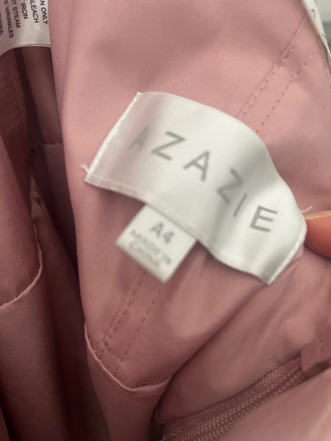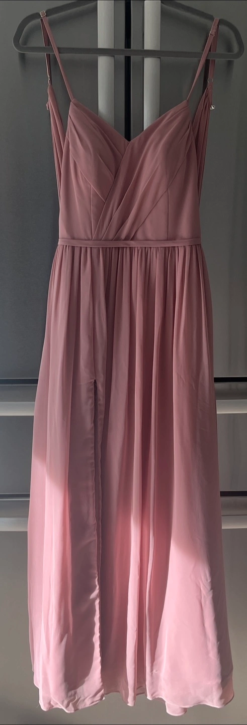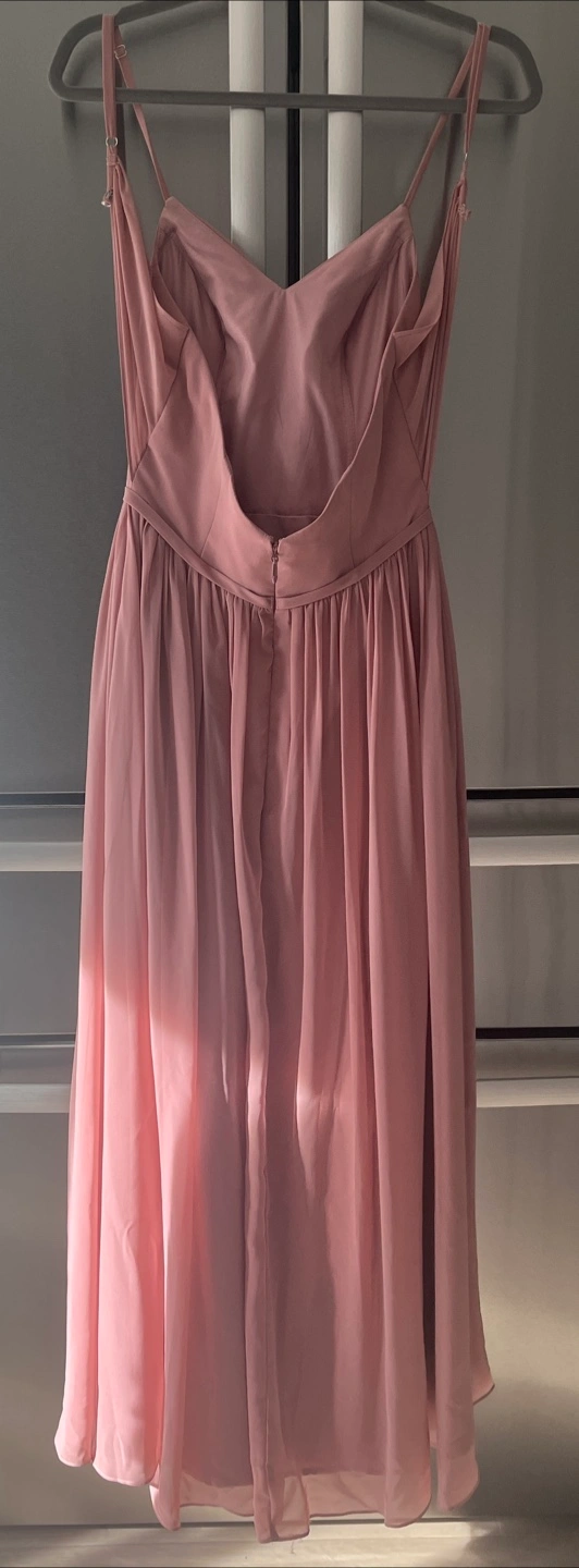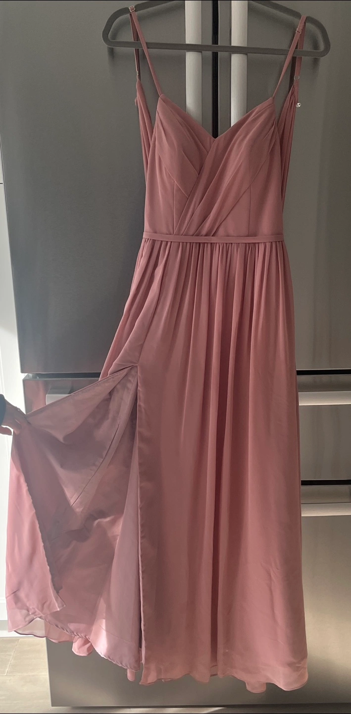 Beautiful dusty rose bridesmaid dress. Features a sweetheart neckline, empire waist, and a thigh-high slit. Size 4. Made in Canada. Was taken up 2” for 5’2” women