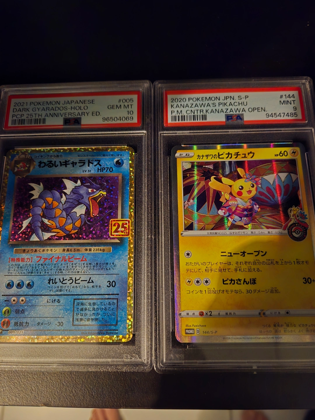 Two PSA-graded Japanese Pokemon cards. One is a Dark Gyrados from the 25th Anniversary set, the other is a Kanazawa's Pikachu promo card. Both cards are in Gem Mint condition.