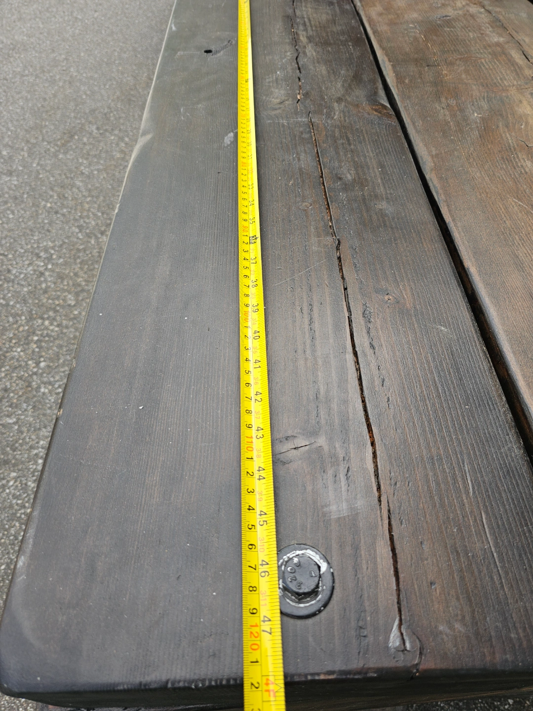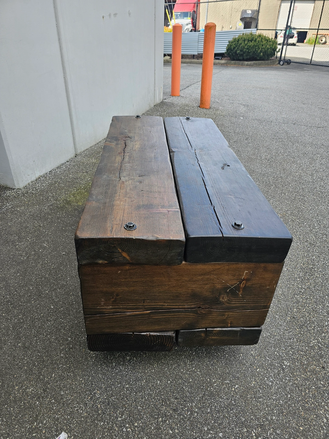 Dark stained wood coffee table. Features a lower shelf for storage. Unique design, heavy and sturdy. Four caster wheels for mobility.v