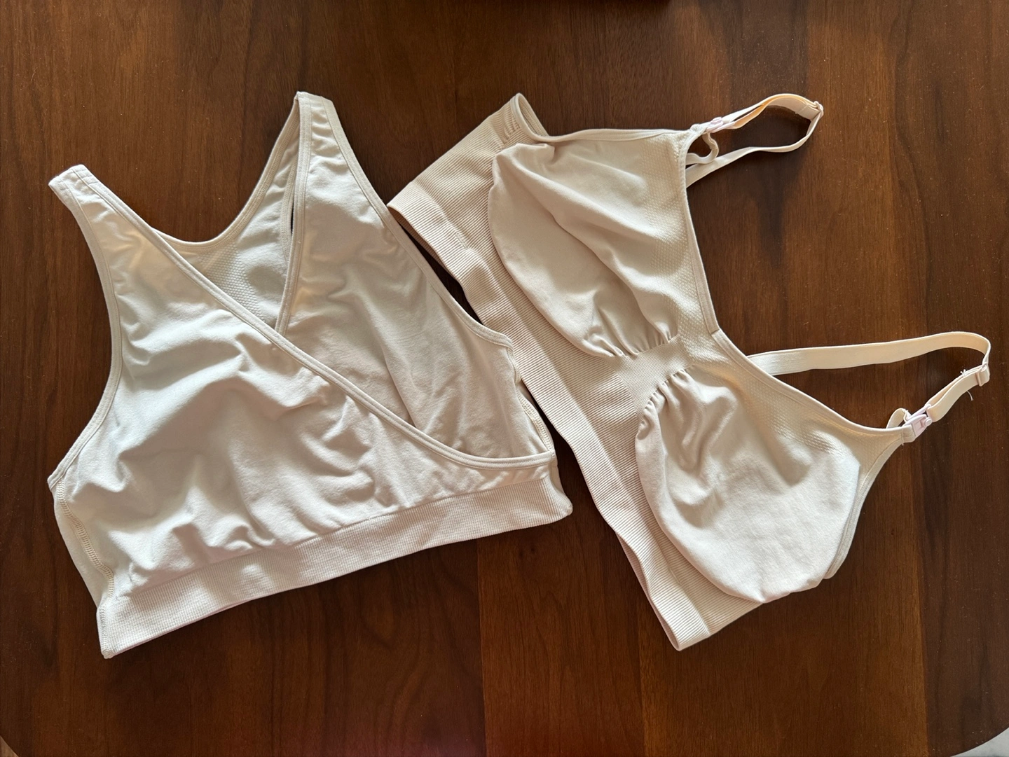 Two beige Madela nursing bras. Gentle/moderate support. Comfortable. Excellent for pregnancy and breastfeeding. Size XL and XXL.