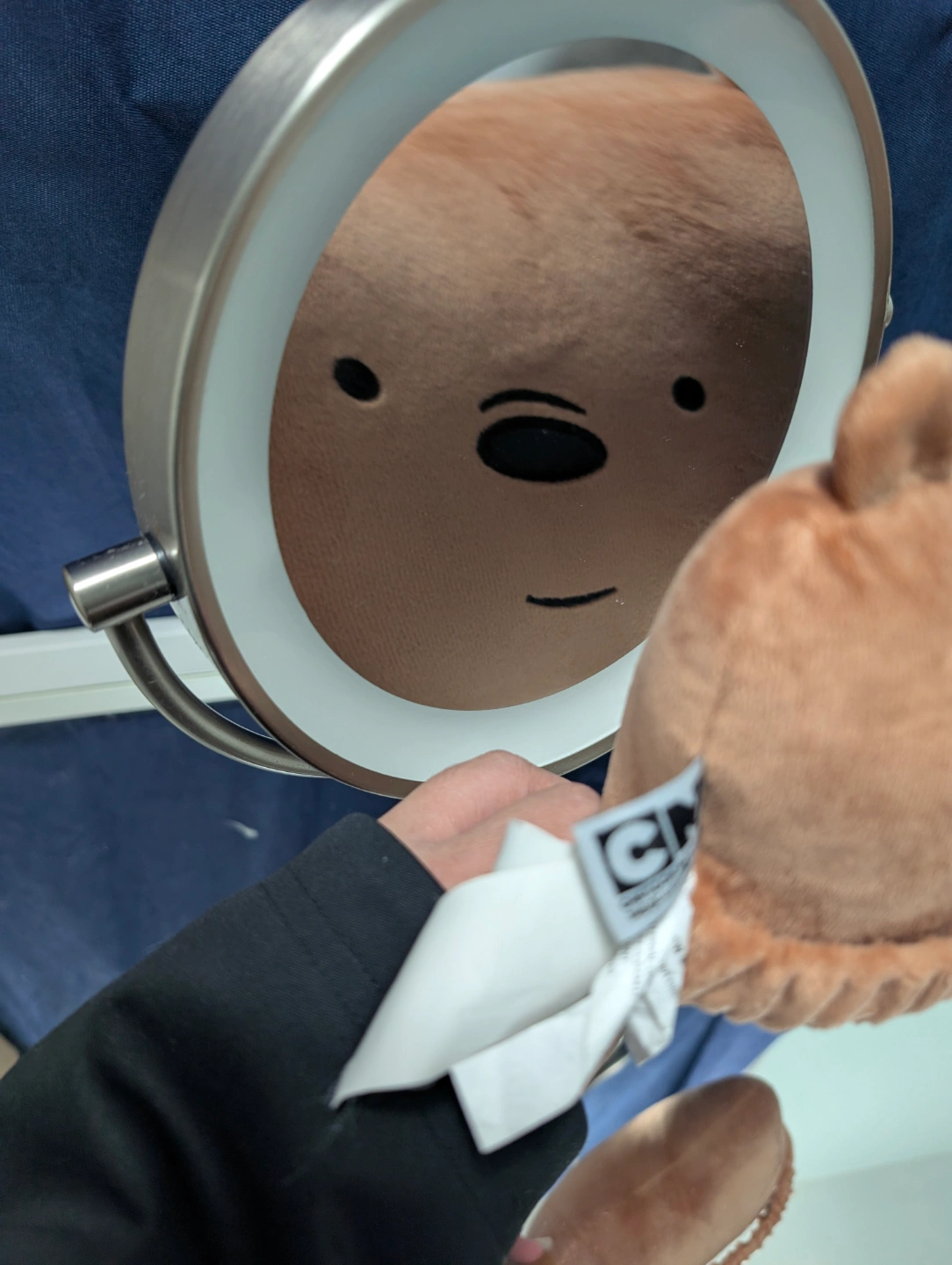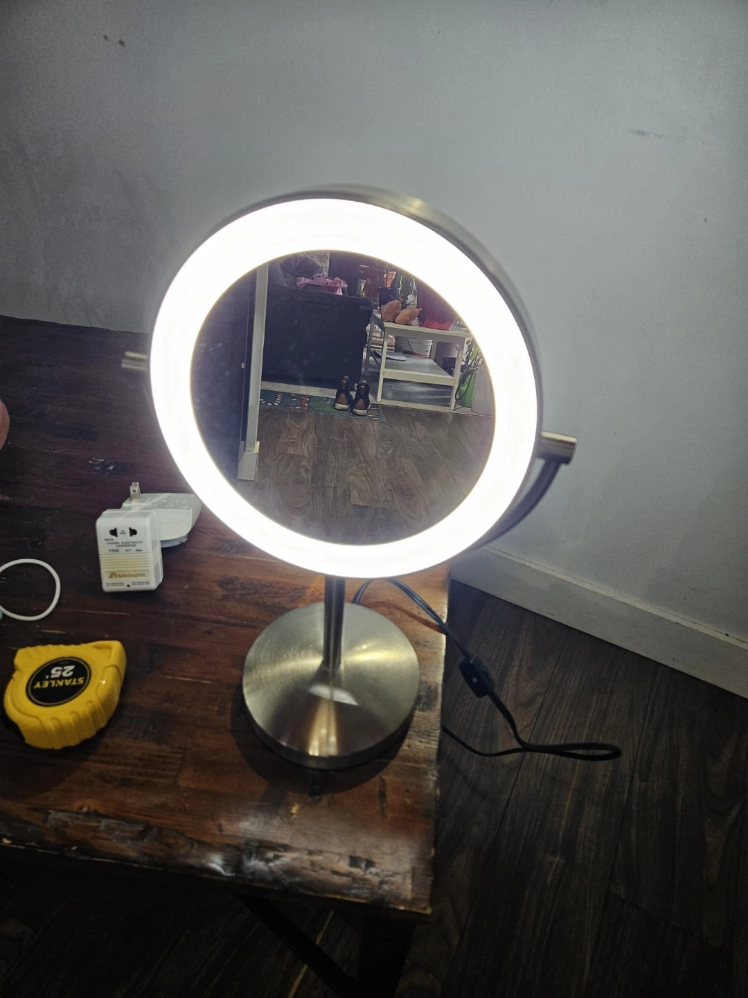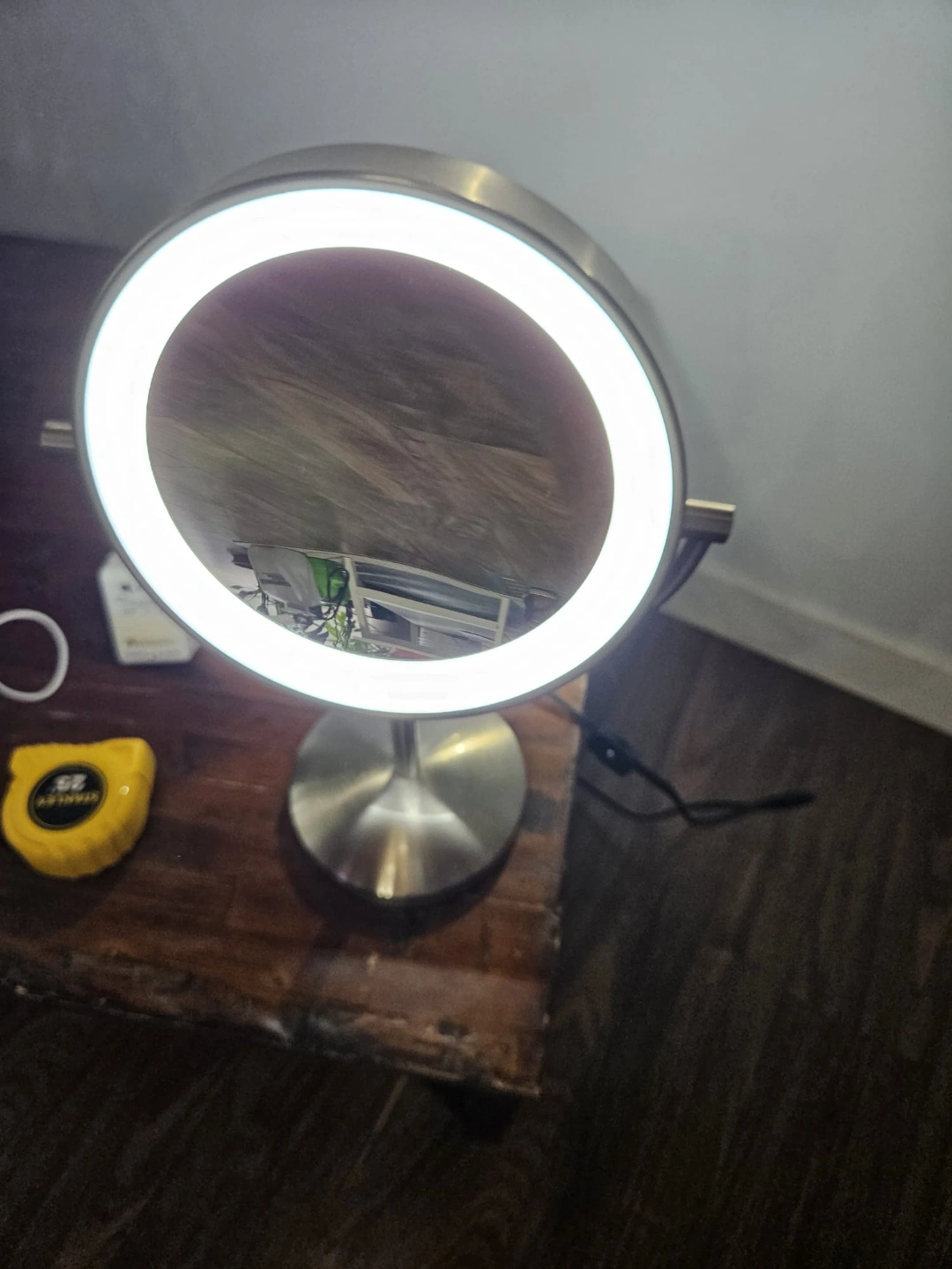 Round double sided mirror with LED light, dual magnification. Features a brushed stainless steel finish. Has a stand for tabletop use.