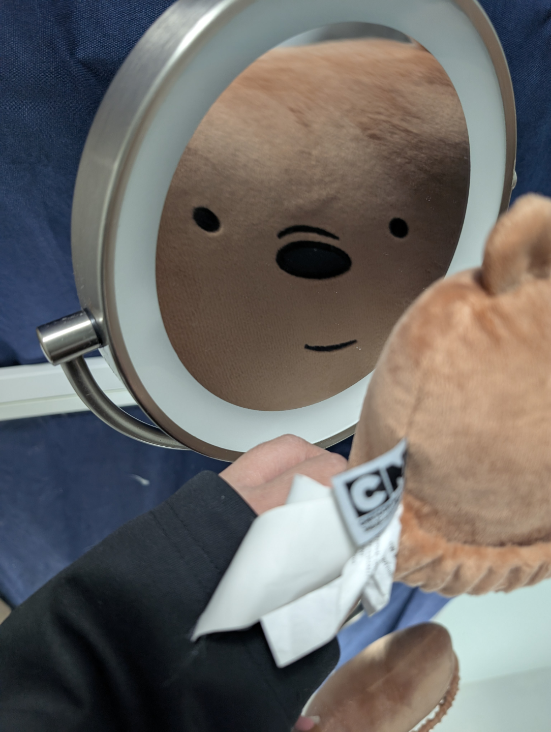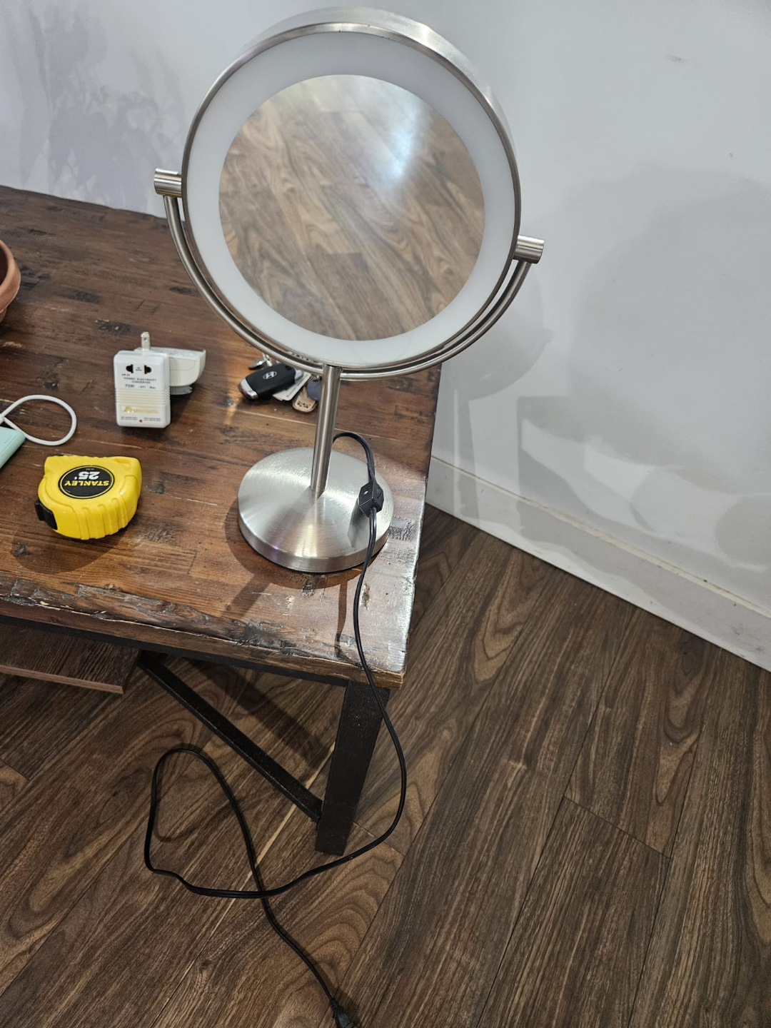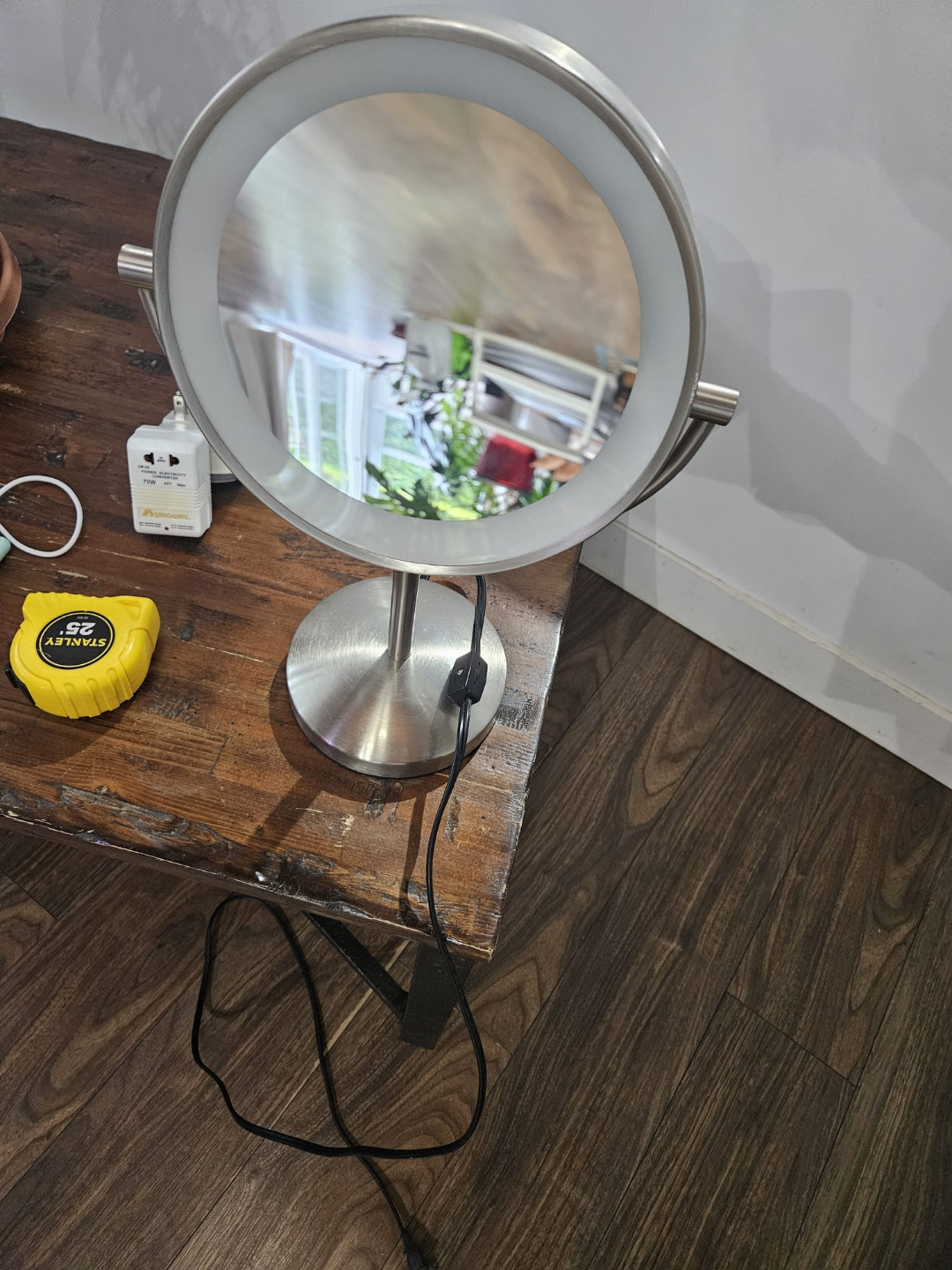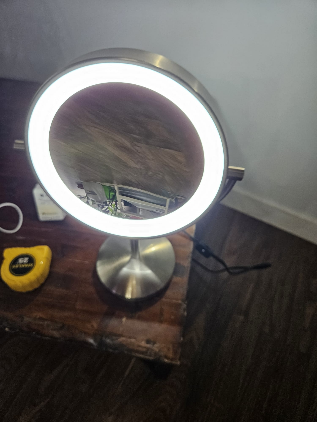 Round double sided mirror with LED light, dual magnification. Features a brushed stainless steel finish. Has a stand for tabletop use.