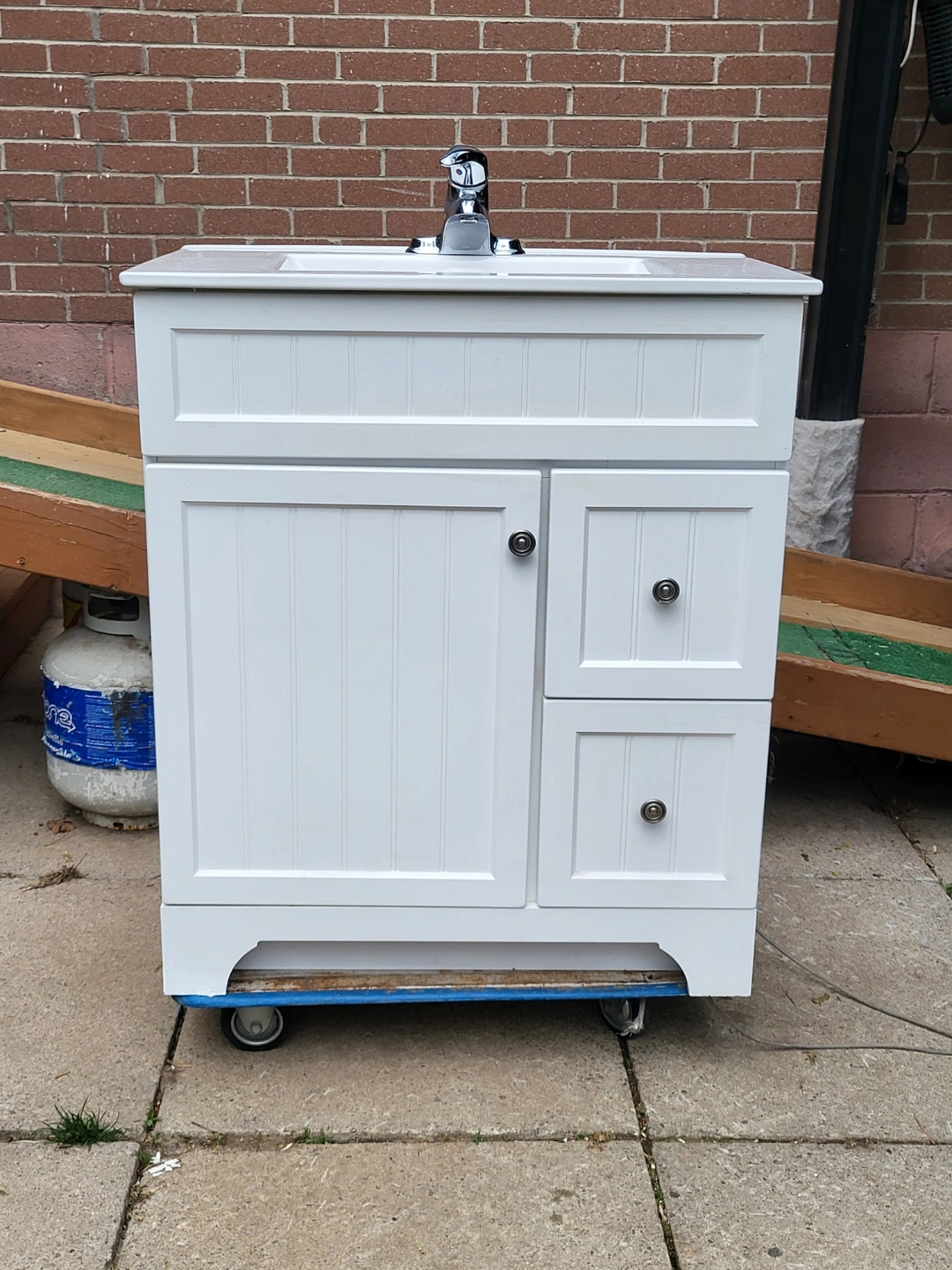 used White vanity with single sink and chrome faucet. Two drawers and one cabinet door. Excellent condition, ready for installation. 401 and islington ave