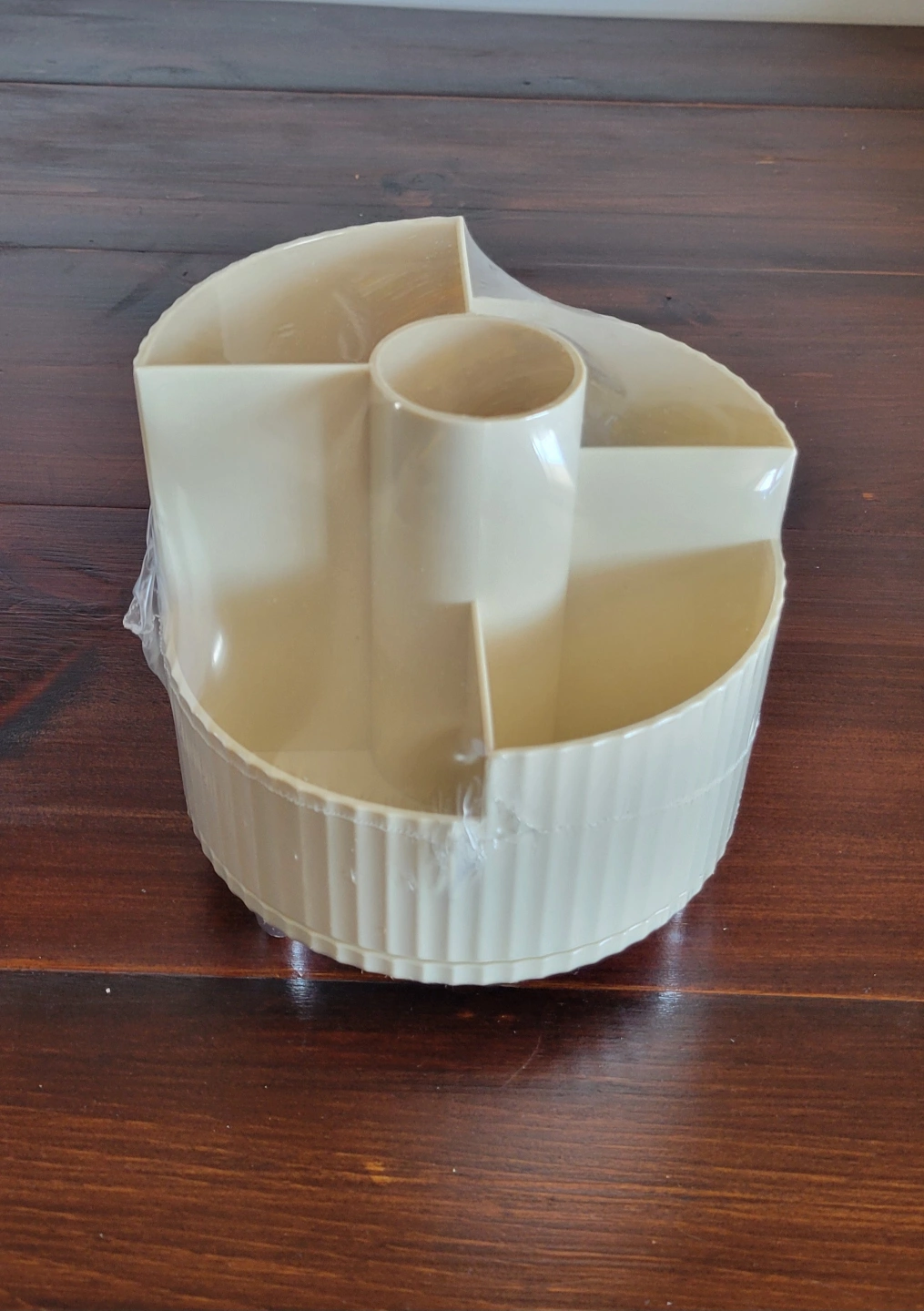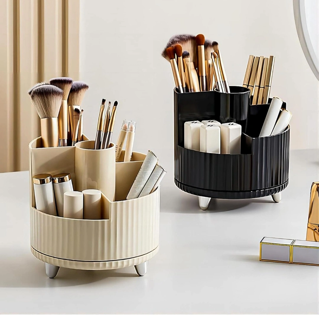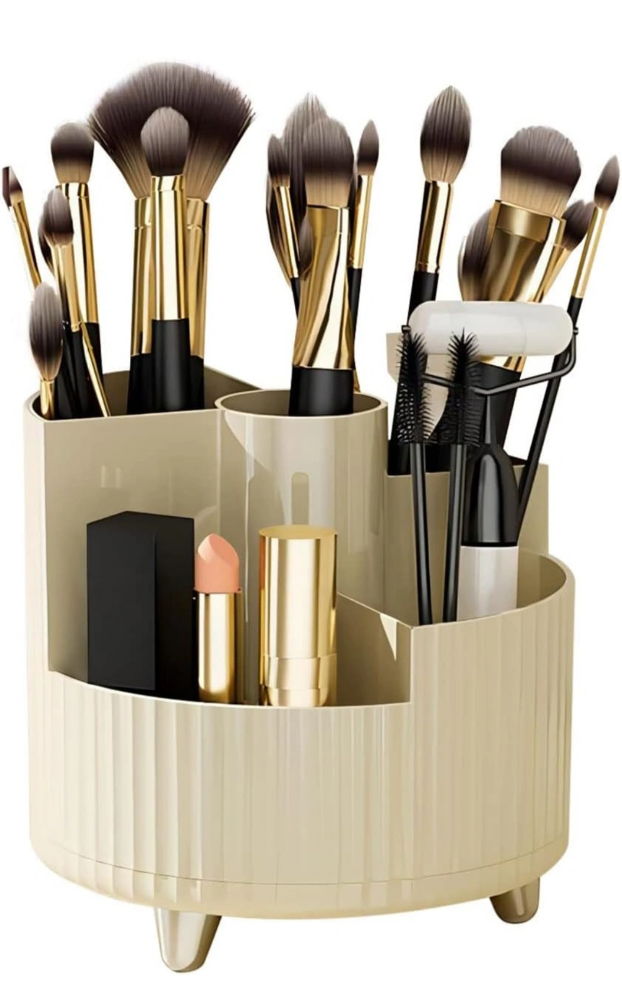 Rotating makeup organizer. Holds brushes and cosmetics. Five compartments. Cream-coloured plastic. Stylish and functional. Great for vanity or countertop.