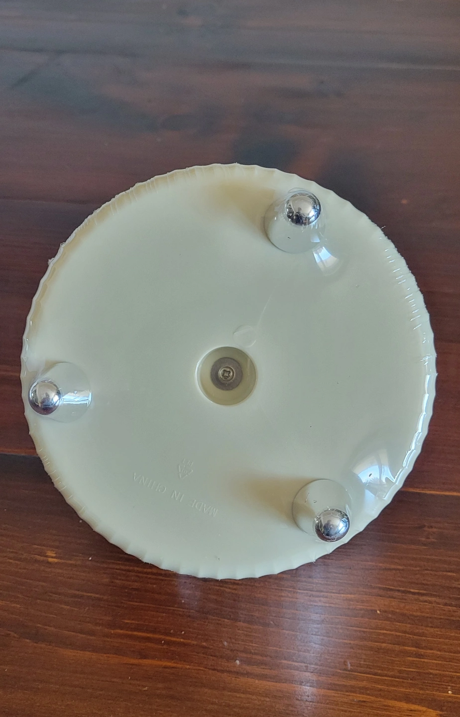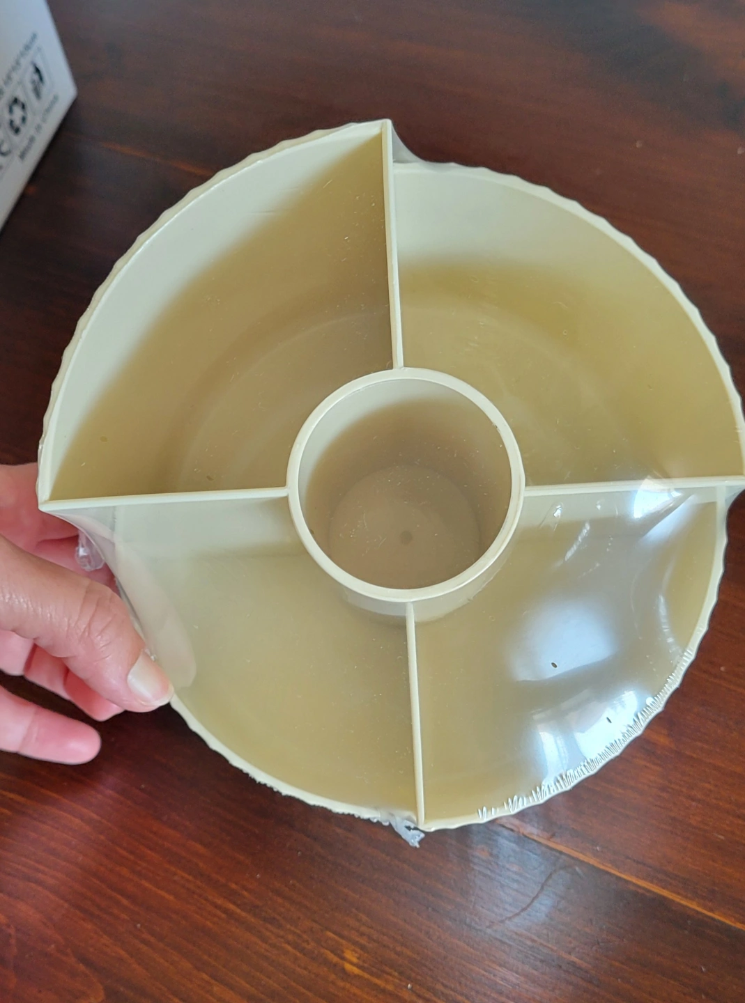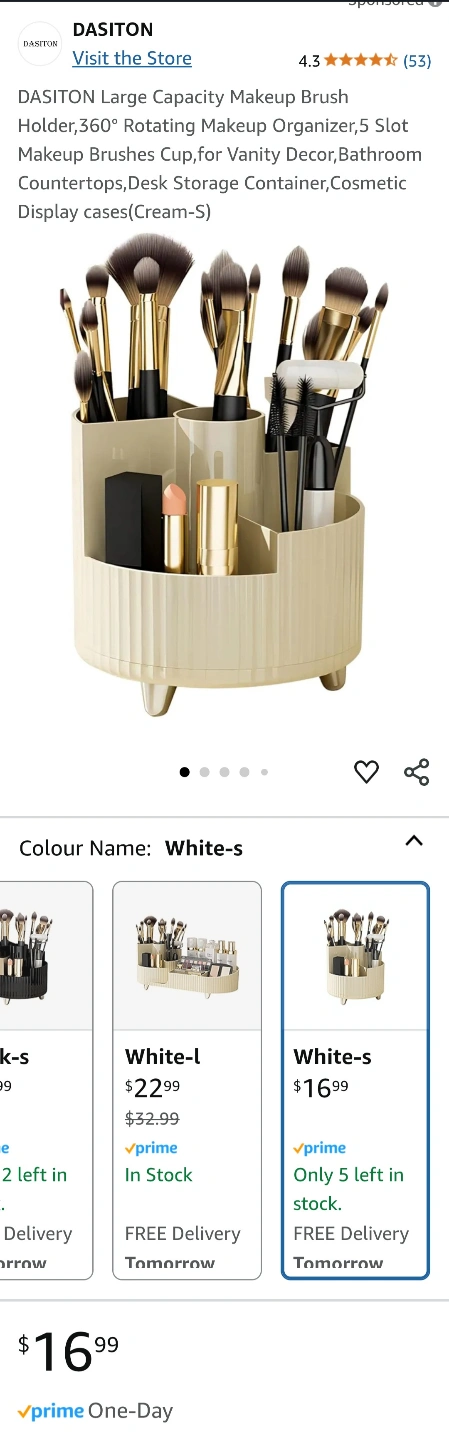Rotating makeup organizer. Holds brushes and cosmetics. Five compartments. Cream-coloured plastic. Stylish and functional. Great for vanity or countertop.
