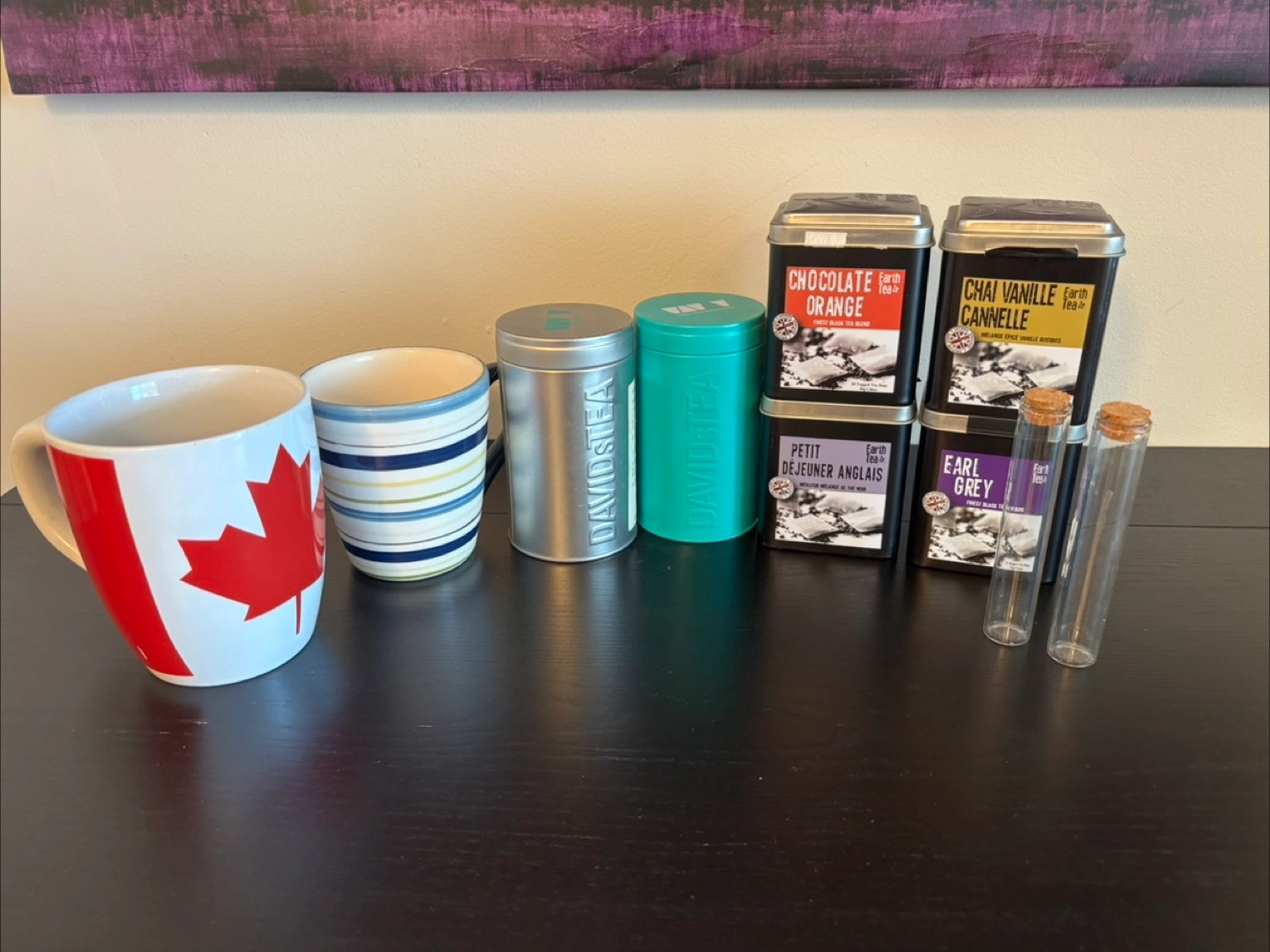 Two mugs, 6 empty Tea tins, two empty glass tea infusers.