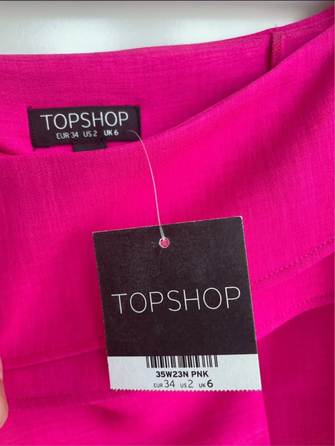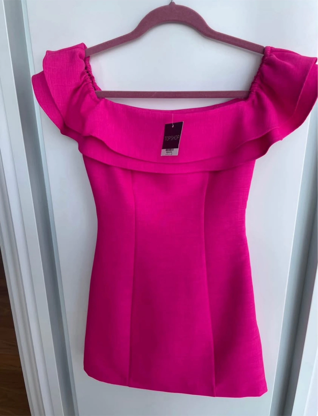 30Stunning hot pink mini dress. Features off-the-shoulder ruffled neckline. Back zipper closure. Size 2 US.
