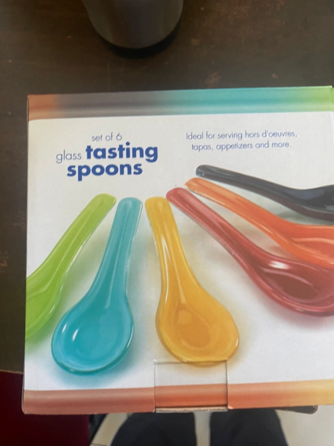 9Six colourful glass tasting spoons. Ideal for serving hors d'oeuvres, tapas, appetizers, and more.