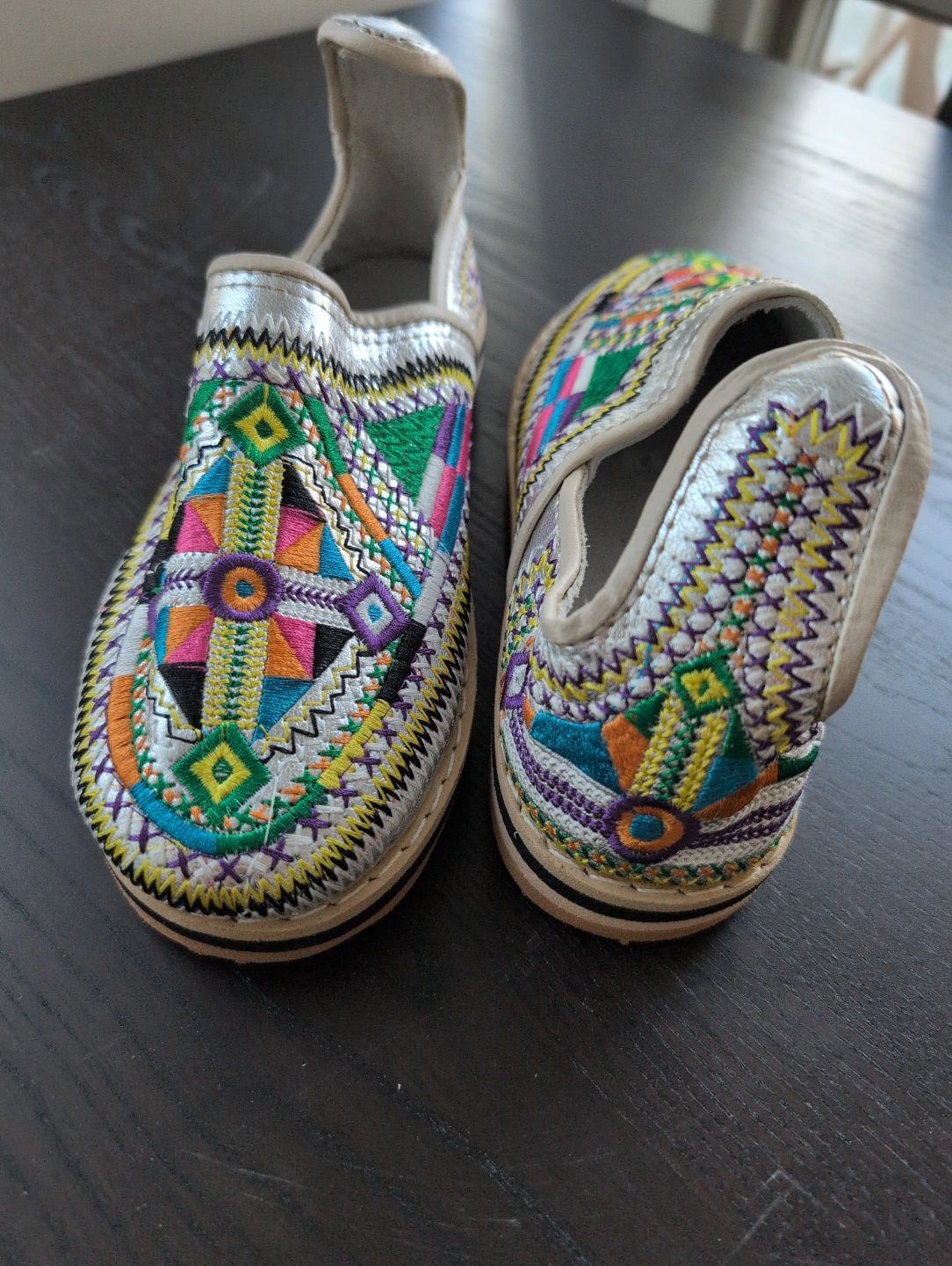Beautiful embroidered babouches - Slippers from Morroco. Multicoloured embroidery. Unique design. Comfortable slip-on style. Close up photos for details included.