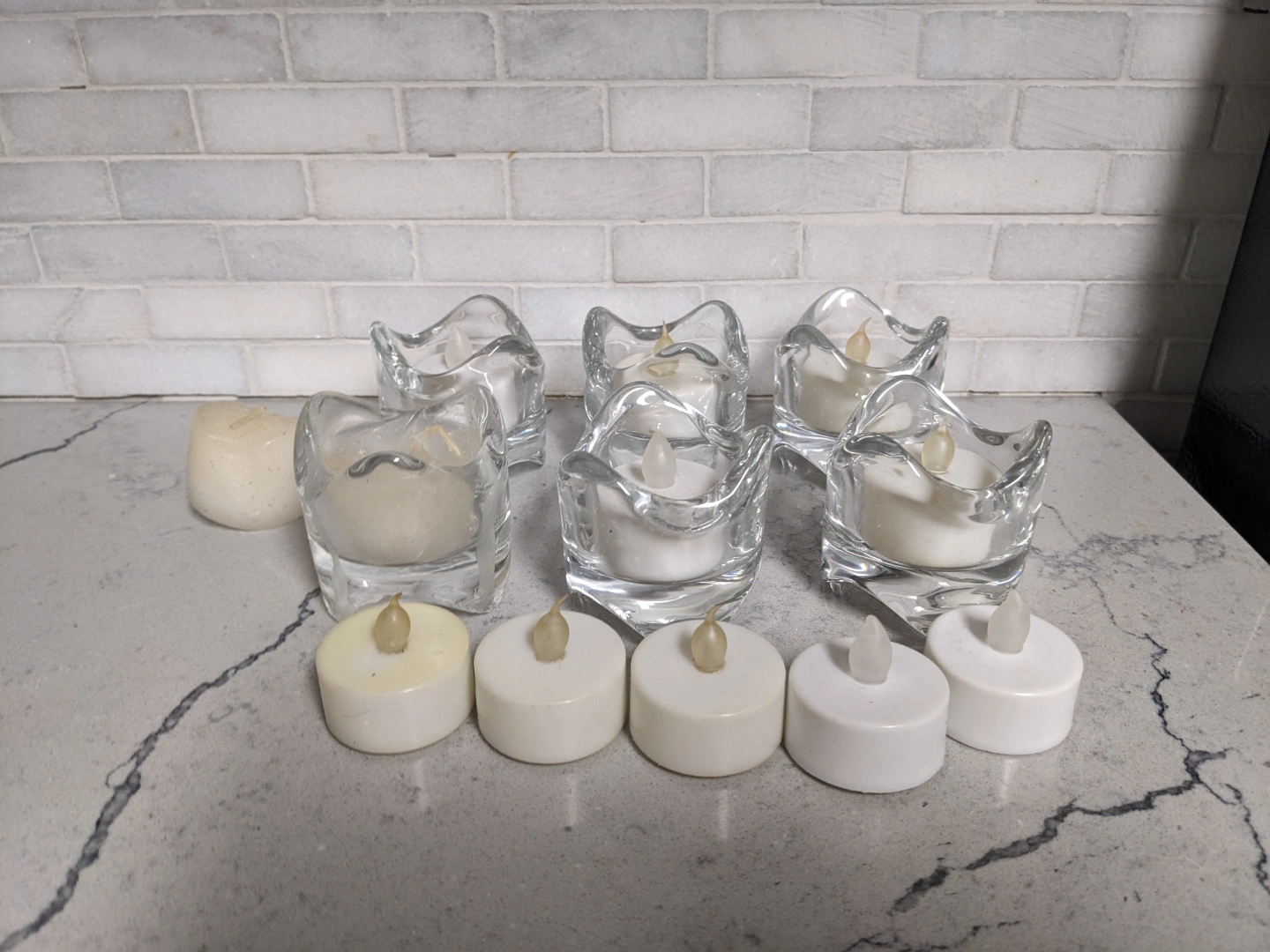 Bulk lot of glass candle holders. Includes several LED tea lights and a few wax tea lights. Some of the LEDs need new batteries.