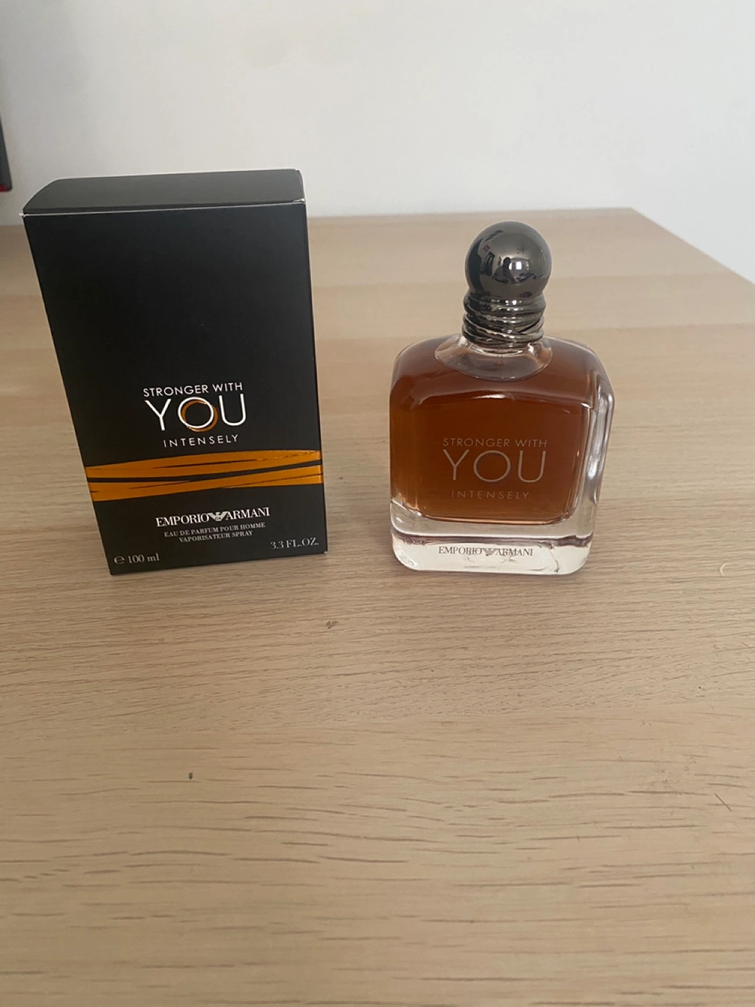 Stronger with you intensely by Armani. Part of my Dad’s Cologne Collection but selling this for some money since he rarely uses any of them.