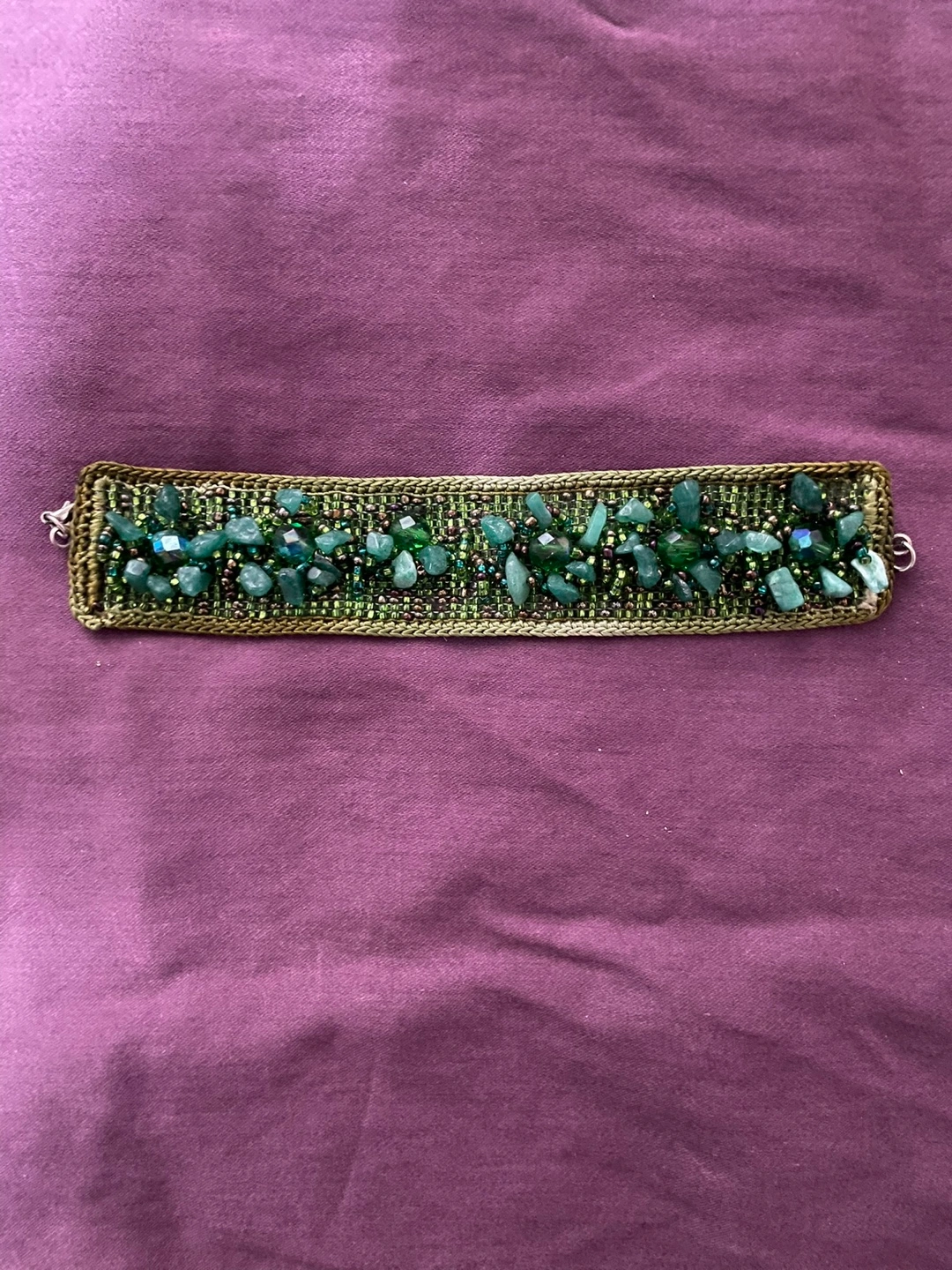 Unique handmade bracelet. Green beaded design. Small stones. Metal clasp closure. Stylish accessory. Great for everyday wear or special occasions.