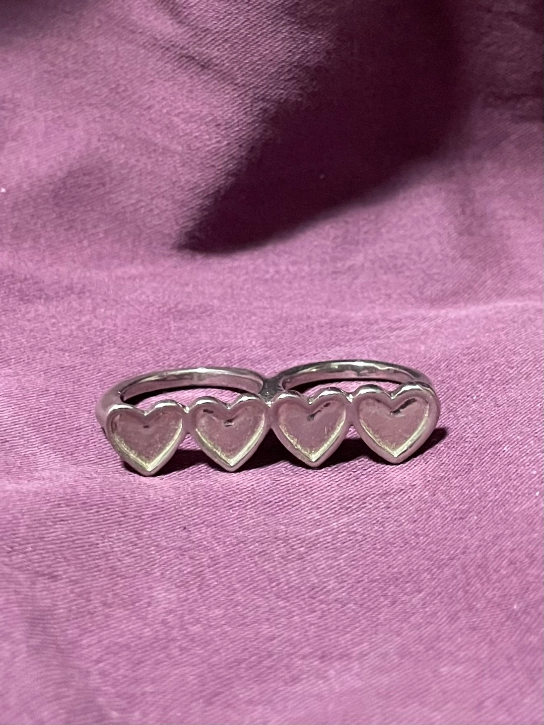 Cute silver double finger ring. Features four heart shapes. Great for stacking or wearing alone. Simple and stylish.