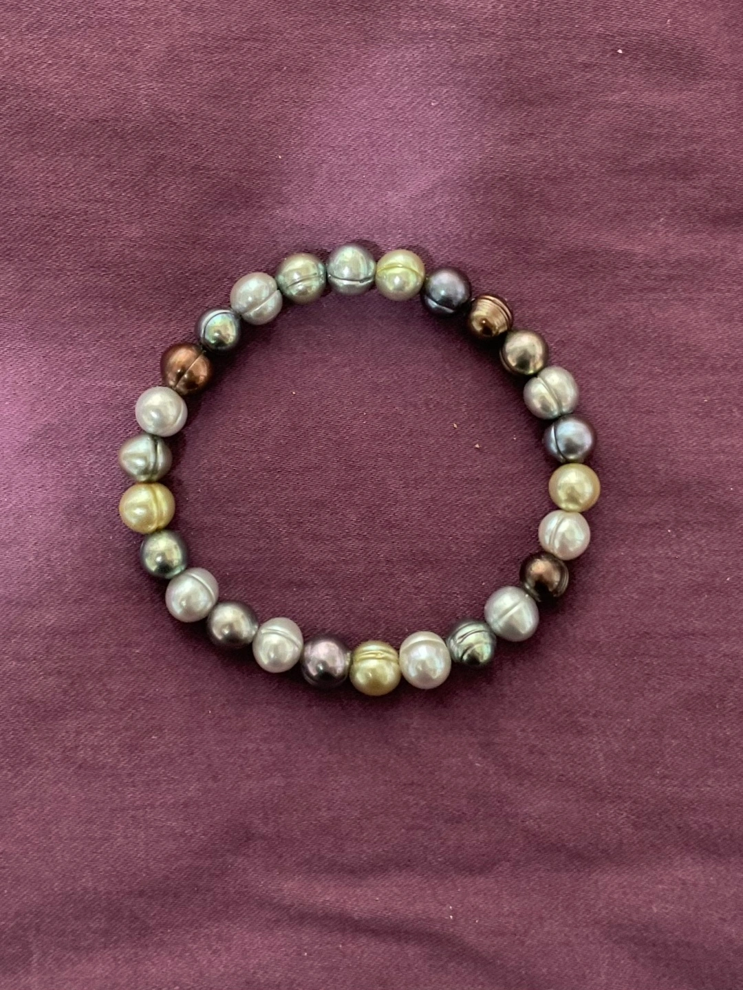 Beautiful bracelet featuring various metal like shades of pearls. Looks great with any outfit. Elegant and timeless.
