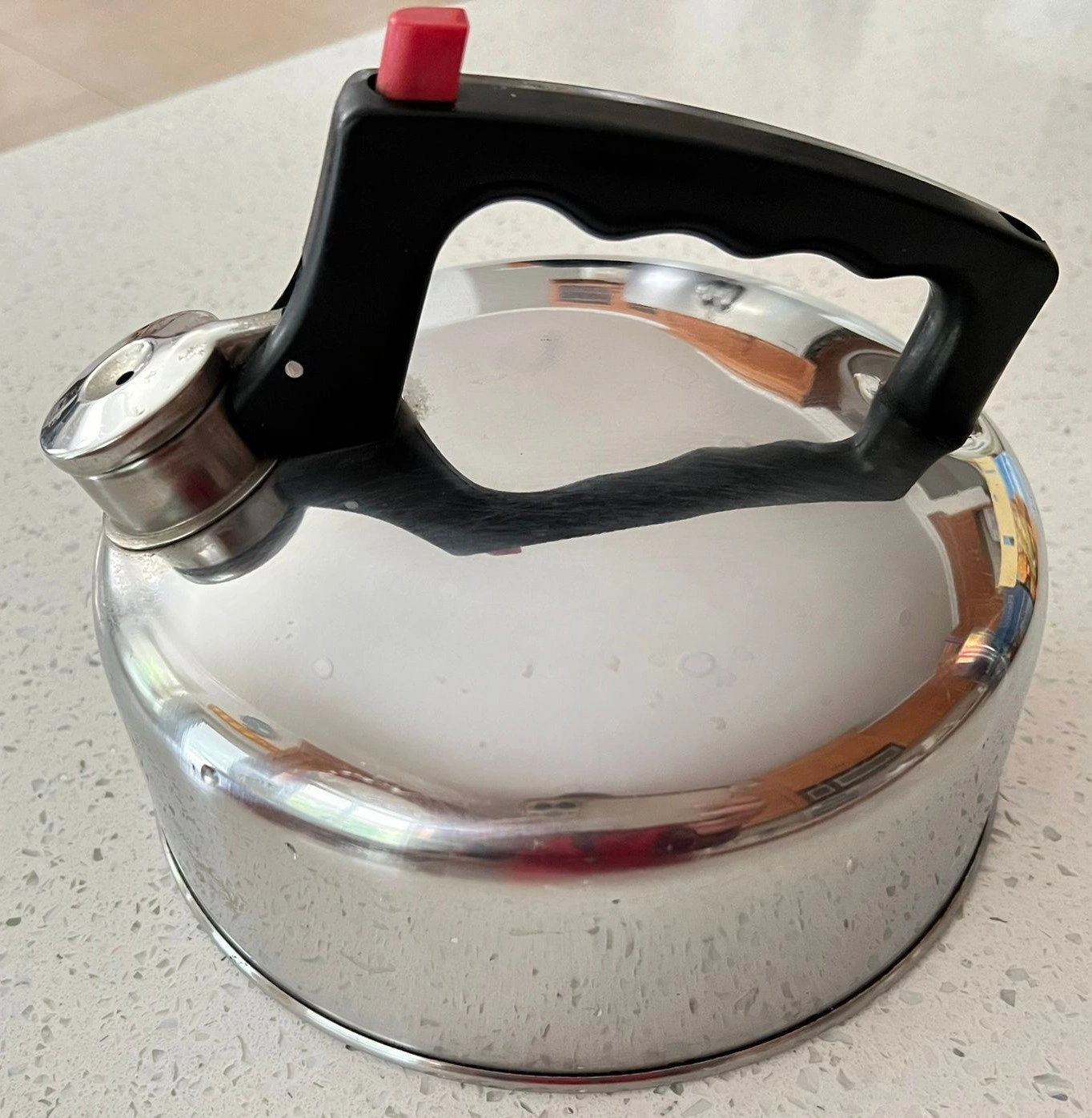 Used stainless steel kettle. Features a black plastic handle and red button. Shows some wear from use.