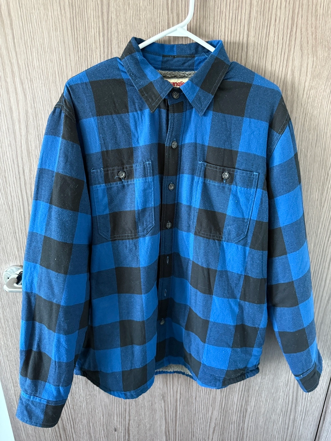 Blue and black buffalo check pattern. Warm sherpa lining. Long sleeves. Button closure. Men's medium.